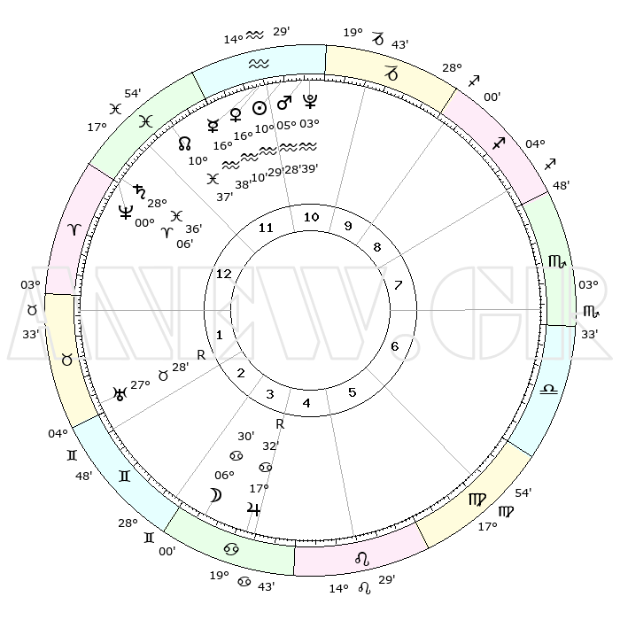 | | ΘΕΣΕΙΣ ΠΛΑΝΗΤΩΝ ΑΣΤΡΟΛΟΓΙΚΟΥ ΧΑΡΤΗ ΤΗΣ ΣΤΙΓΜΗΣ ΑΥΤΗΣ | | | | Πλανήτης | Ζώδιο | Μοίρες | Δεκαήμ. | Σε οίκο | Απόκλιση | | Ακμές των οίκων | | Ηλιος | Υδροχόος | 10°25' | Δεύτερο | 11 | 17 S 37 | | 1ος | 26°46' | Ιχθείς | | Σελήνη | Καρκίνος | 05°33' | Πρώτο | 4 | 27 N 59 | | 2ος | 07°49' | Ταύρος | | Ερμής | Υδροχόος | 16°32' | Δεύτερο | 11 | 17 S 45 | | 3ος | 05°44' | Δίδυμοι | | Αφροδίτη | Υδροχόος | 16°05' | Δεύτερο | 11 | 17 S 17 | | 4ος | 28°11' | Δίδυμοι | | Αρης | Υδροχόος | 05°25' | Πρώτο | 11 | 19 S 55 | | 5ος | 20°21' | Καρκίνος | | Δίας | Καρκίνος | 17°33'R | Δεύτερο | 4 | 22 N 35 | | 6ος | 17°16' | Λέων | | Κρόνος | Ιχθείς | 28°36' | Τρίτο | 1 | 02 S 33 | | 7ος | 26°46' | Παρθένος | | Ουρανός | Ταύρος | 27°28'R | Τρίτο | 2 | 19 N 24 | | 8ος | 07°49' | Σκορπιός | | Ποσειδώνας | Κριός | 00°06' | Πρώτο | 1 | 01 S 10 | | 9ος | 05°44' | Τοξότης | | Πλούτωνας | Υδροχόος | 03°39' | Πρώτο | 11 | 23 S 02 | | 10ος | 28°11' | Τοξότης | | Β. Δεσμός | Ιχθείς | 10°37' | Δεύτερο | 12 | 07 S 35 | | 11ος | 20°21' | Αιγόκερως | | Ωροσκόπος | Ιχθείς | 26°46' | Τρίτο | | | 12ος | 17°16' | Υδροχόος | | Μεσουράνημα | Τοξότης | 28°11' | Τρίτο | | | |