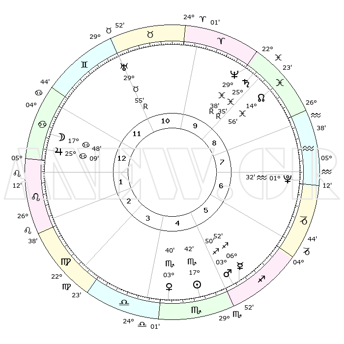 | | ΘΕΣΕΙΣ ΠΛΑΝΗΤΩΝ ΑΣΤΡΟΛΟΓΙΚΟΥ ΧΑΡΤΗ ΤΗΣ ΣΤΙΓΜΗΣ ΑΥΤΗΣ | | | | Πλανήτης | Ζώδιο | Μοίρες | Δεκαήμ. | Σε οίκο | Απόκλιση | | Ακμές των οίκων | | Ηλιος | Σκορπιός | 17°35' | Δεύτερο | 5 | 17 S 04 | | 1ος | 01°55' | Καρκίνος | | Σελήνη | Καρκίνος | 16°14' | Δεύτερο | 1 | 26 N 49 | | 2ος | 22°36' | Καρκίνος | | Ερμής | Τοξότης | 06°52' | Πρώτο | 6 | 23 S 47 | | 3ος | 14°32' | Λέων | | Αφροδίτη | Σκορπιός | 03°32' | Πρώτο | 5 | 11 S 26 | | 4ος | 11°10' | Παρθένος | | Αρης | Τοξότης | 03°45' | Πρώτο | 6 | 21 S 22 | | 5ος | 15°24' | Ζυγός | | Δίας | Καρκίνος | 25°09' | Τρίτο | 2 | 21 N 12 | | 6ος | 25°15' | Σκορπιός | | Κρόνος | Ιχθείς | 25°35'R | Τρίτο | 10 | 04 S 00 | | 7ος | 01°55' | Αιγόκερως | | Ουρανός | Ταύρος | 29°56'R | Τρίτο | 12 | 19 N 56 | | 8ος | 22°36' | Αιγόκερως | | Ποσειδώνας | Ιχθείς | 29°38'R | Τρίτο | 10 | 01 S 24 | | 9ος | 14°32' | Υδροχόος | | Πλούτωνας | Υδροχόος | 01°32' | Πρώτο | 8 | 23 S 29 | | 10ος | 11°10' | Ιχθείς | | Β. Δεσμός | Ιχθείς | 14°56' | Δεύτερο | 10 | 05 S 56 | | 11ος | 15°24' | Κριός | | Ωροσκόπος | Καρκίνος | 01°55' | Πρώτο | | | 12ος | 25°15' | Ταύρος | | Μεσουράνημα | Ιχθείς | 11°10' | Δεύτερο | | | |