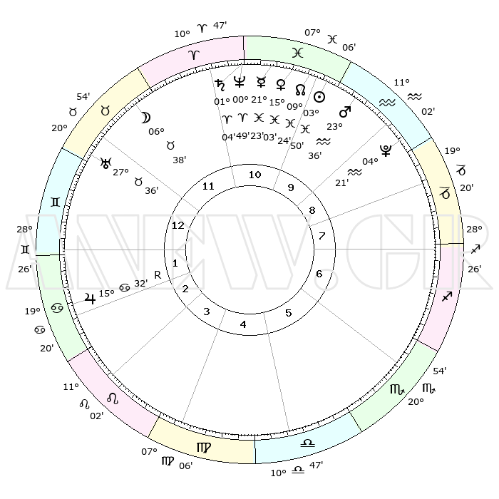 | | ΘΕΣΕΙΣ ΠΛΑΝΗΤΩΝ ΑΣΤΡΟΛΟΓΙΚΟΥ ΧΑΡΤΗ ΤΗΣ ΣΤΙΓΜΗΣ ΑΥΤΗΣ | | | | Πλανήτης | Ζώδιο | Μοίρες | Δεκαήμ. | Σε οίκο | Απόκλιση | | Ακμές των οίκων | | Ηλιος | Ιχθείς | 03°45' | Πρώτο | 10 | 10 S 08 | | 1ος | 28°18' | Ταύρος | | Σελήνη | Ταύρος | 05°31' | Πρώτο | 12 | 17 N 31 | | 2ος | 23°28' | Δίδυμοι | | Ερμής | Ιχθείς | 21°20' | Τρίτο | 11 | 01 S 44 | | 3ος | 14°57' | Καρκίνος | | Αφροδίτη | Ιχθείς | 14°57' | Δεύτερο | 11 | 07 S 15 | | 4ος | 07°35' | Λέων | | Αρης | Υδροχόος | 23°32' | Τρίτο | 10 | 14 S 42 | | 5ος | 05°46' | Παρθένος | | Δίας | Καρκίνος | 15°33'R | Δεύτερο | 3 | 22 N 52 | | 6ος | 13°56' | Ζυγός | | Κρόνος | Κριός | 01°04' | Πρώτο | 11 | 01 S 32 | | 7ος | 28°18' | Σκορπιός | | Ουρανός | Ταύρος | 27°36' | Τρίτο | 12 | 19 N 27 | | 8ος | 23°28' | Τοξότης | | Ποσειδώνας | Κριός | 00°49' | Πρώτο | 11 | 00 S 53 | | 9ος | 14°57' | Αιγόκερως | | Πλούτωνας | Υδροχόος | 04°21' | Πρώτο | 9 | 22 S 54 | | 10ος | 07°35' | Υδροχόος | | Β. Δεσμός | Ιχθείς | 09°24' | Πρώτο | 11 | 08 S 03 | | 11ος | 05°46' | Ιχθείς | | Ωροσκόπος | Ταύρος | 28°18' | Τρίτο | | | 12ος | 13°56' | Κριός | | Μεσουράνημα | Υδροχόος | 07°35' | Πρώτο | | | |