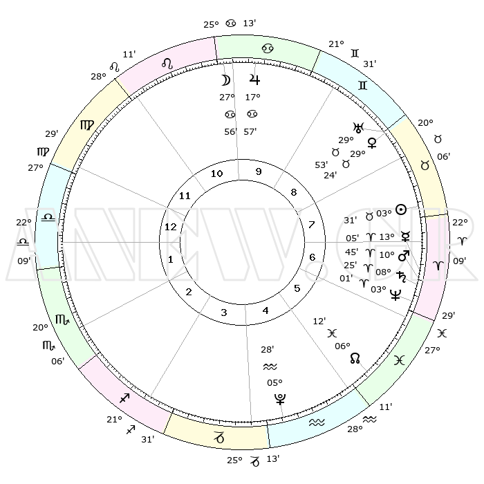 | | ΘΕΣΕΙΣ ΠΛΑΝΗΤΩΝ ΑΣΤΡΟΛΟΓΙΚΟΥ ΧΑΡΤΗ ΤΗΣ ΣΤΙΓΜΗΣ ΑΥΤΗΣ | | | | Πλανήτης | Ζώδιο | Μοίρες | Δεκαήμ. | Σε οίκο | Απόκλιση | | Ακμές των οίκων | | Ηλιος | Ταύρος | 03°28' | Πρώτο | 8 | 12 N 40 | | 1ος | 04°23' | Ζυγός | | Σελήνη | Καρκίνος | 27°06' | Τρίτο | 10 | 23 N 58 | | 2ος | 01°17' | Σκορπιός | | Ερμής | Κριός | 12°59' | Δεύτερο | 7 | 02 N 49 | | 3ος | 01°53' | Τοξότης | | Αφροδίτη | Ταύρος | 29°20' | Τρίτο | 8 | 20 N 33 | | 4ος | 04°56' | Αιγόκερως | | Αρης | Κριός | 10°42' | Δεύτερο | 7 | 03 N 23 | | 5ος | 07°52' | Υδροχόος | | Δίας | Καρκίνος | 17°57' | Δεύτερο | 10 | 22 N 37 | | 6ος | 08°08' | Ιχθείς | | Κρόνος | Κριός | 08°25' | Πρώτο | 7 | 01 N 21 | | 7ος | 04°23' | Κριός | | Ουρανός | Ταύρος | 29°52' | Τρίτο | 8 | 19 N 57 | | 8ος | 01°17' | Ταύρος | | Ποσειδώνας | Κριός | 03°01' | Πρώτο | 6 | 00 S 00 | | 9ος | 01°53' | Δίδυμοι | | Πλούτωνας | Υδροχόος | 05°28' | Πρώτο | 4 | 22 S 48 | | 10ος | 04°56' | Καρκίνος | | Β. Δεσμός | Ιχθείς | 06°12' | Πρώτο | 5 | 09 S 14 | | 11ος | 07°52' | Λέων | | Ωροσκόπος | Ζυγός | 04°23' | Πρώτο | | | 12ος | 08°08' | Παρθένος | | Μεσουράνημα | Καρκίνος | 04°56' | Πρώτο | | | |