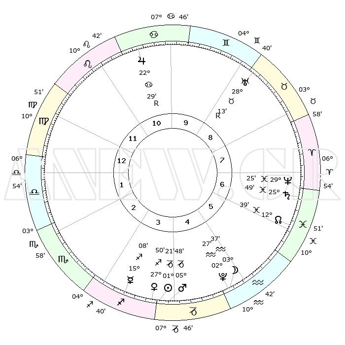 | | ΘΕΣΕΙΣ ΠΛΑΝΗΤΩΝ ΑΣΤΡΟΛΟΓΙΚΟΥ ΧΑΡΤΗ ΤΗΣ ΣΤΙΓΜΗΣ ΑΥΤΗΣ | | | | Πλανήτης | Ζώδιο | Μοίρες | Δεκαήμ. | Σε οίκο | Απόκλιση | | Ακμές των οίκων | | Ηλιος | Αιγόκερως | 01°16' | Πρώτο | 4 | 23 S 26 | | 1ος | 10°44' | Παρθένος | | Σελήνη | Υδροχόος | 02°31' | Πρώτο | 5 | 22 S 41 | | 2ος | 05°41' | Ζυγός | | Ερμής | Τοξότης | 14°60' | Δεύτερο | 4 | 22 S 04 | | 3ος | 05°11' | Σκορπιός | | Αφροδίτη | Τοξότης | 27°43' | Τρίτο | 4 | 23 S 34 | | 4ος | 08°08' | Τοξότης | | Αρης | Αιγόκερως | 05°44' | Πρώτο | 4 | 24 S 08 | | 5ος | 11°41' | Αιγόκερως | | Δίας | Καρκίνος | 22°30'R | Τρίτο | 11 | 21 N 46 | | 6ος | 12°56' | Υδροχόος | | Κρόνος | Ιχθείς | 25°49' | Τρίτο | 7 | 03 S 46 | | 7ος | 10°44' | Ιχθείς | | Ουρανός | Ταύρος | 28°13'R | Τρίτο | 9 | 19 N 34 | | 8ος | 05°41' | Κριός | | Ποσειδώνας | Ιχθείς | 29°25' | Τρίτο | 7 | 01 S 28 | | 9ος | 05°10' | Ταύρος | | Πλούτωνας | Υδροχόος | 02°27' | Πρώτο | 5 | 23 S 17 | | 10ος | 08°08' | Δίδυμοι | | Β. Δεσμός | Ιχθείς | 12°39' | Δεύτερο | 7 | 06 S 49 | | 11ος | 11°41' | Καρκίνος | | Ωροσκόπος | Παρθένος | 10°44' | Δεύτερο | | | 12ος | 12°56' | Λέων | | Μεσουράνημα | Δίδυμοι | 08°08' | Πρώτο | | | |