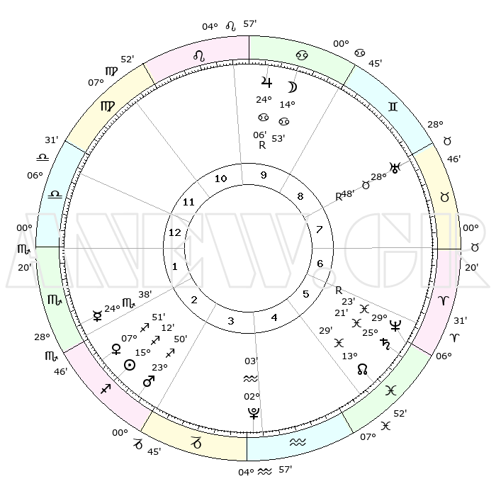 | | ΘΕΣΕΙΣ ΠΛΑΝΗΤΩΝ ΑΣΤΡΟΛΟΓΙΚΟΥ ΧΑΡΤΗ ΤΗΣ ΣΤΙΓΜΗΣ ΑΥΤΗΣ | | | | Πλανήτης | Ζώδιο | Μοίρες | Δεκαήμ. | Σε οίκο | Απόκλιση | | Ακμές των οίκων | | Ηλιος | Τοξότης | 15°10' | Δεύτερο | 2 | 22 S 36 | | 1ος | 18°46' | Ζυγός | | Σελήνη | Καρκίνος | 14°18' | Δεύτερο | 9 | 26 N 56 | | 2ος | 16°32' | Σκορπιός | | Ερμής | Σκορπιός | 24°36' | Τρίτο | 2 | 16 S 35 | | 3ος | 17°46' | Τοξότης | | Αφροδίτη | Τοξότης | 07°48' | Πρώτο | 2 | 21 S 08 | | 4ος | 21°18' | Αιγόκερως | | Αρης | Τοξότης | 23°48' | Τρίτο | 3 | 24 S 00 | | 5ος | 24°15' | Υδροχόος | | Δίας | Καρκίνος | 24°06'R | Τρίτο | 10 | 21 N 27 | | 6ος | 23°47' | Ιχθείς | | Κρόνος | Ιχθείς | 25°21' | Τρίτο | 6 | 04 S 00 | | 7ος | 18°46' | Κριός | | Ουρανός | Ταύρος | 28°48'R | Τρίτο | 8 | 19 N 41 | | 8ος | 16°32' | Ταύρος | | Ποσειδώνας | Ιχθείς | 29°23'R | Τρίτο | 6 | 01 S 29 | | 9ος | 17°46' | Δίδυμοι | | Πλούτωνας | Υδροχόος | 02°03' | Πρώτο | 4 | 23 S 22 | | 10ος | 21°18' | Καρκίνος | | Β. Δεσμός | Ιχθείς | 13°29' | Δεύτερο | 5 | 06 S 29 | | 11ος | 24°15' | Λέων | | Ωροσκόπος | Ζυγός | 18°46' | Δεύτερο | | | 12ος | 23°47' | Παρθένος | | Μεσουράνημα | Καρκίνος | 21°18' | Τρίτο | | | |