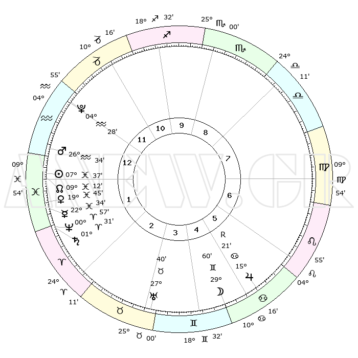 | | ΘΕΣΕΙΣ ΠΛΑΝΗΤΩΝ ΑΣΤΡΟΛΟΓΙΚΟΥ ΧΑΡΤΗ ΤΗΣ ΣΤΙΓΜΗΣ ΑΥΤΗΣ | | | | Πλανήτης | Ζώδιο | Μοίρες | Δεκαήμ. | Σε οίκο | Απόκλιση | | Ακμές των οίκων | | Ηλιος | Ιχθείς | 07°33' | Πρώτο | 1 | 08 S 44 | | 1ος | 07°10' | Υδροχόος | | Σελήνη | Δίδυμοι | 29°05' | Τρίτο | 5 | 28 N 23 | | 2ος | 22°16' | Ιχθείς | | Ερμής | Ιχθείς | 22°34' | Τρίτο | 2 | 00 S 25 | | 3ος | 29°29' | Κριός | | Αφροδίτη | Ιχθείς | 19°40' | Δεύτερο | 1 | 05 S 22 | | 4ος | 26°46' | Ταύρος | | Αρης | Υδροχόος | 26°30' | Τρίτο | 1 | 13 S 42 | | 5ος | 19°04' | Δίδυμοι | | Δίας | Καρκίνος | 15°22'R | Δεύτερο | 6 | 22 N 53 | | 6ος | 10°49' | Καρκίνος | | Κρόνος | Κριός | 01°30' | Πρώτο | 2 | 01 S 22 | | 7ος | 07°10' | Λέων | | Ουρανός | Ταύρος | 27°40' | Τρίτο | 4 | 19 N 28 | | 8ος | 22°16' | Παρθένος | | Ποσειδώνας | Κριός | 00°57' | Πρώτο | 2 | 00 S 49 | | 9ος | 29°29' | Ζυγός | | Πλούτωνας | Υδροχόος | 04°28' | Πρώτο | 12 | 22 S 53 | | 10ος | 26°46' | Σκορπιός | | Β. Δεσμός | Ιχθείς | 09°12' | Πρώτο | 1 | 08 S 07 | | 11ος | 19°04' | Τοξότης | | Ωροσκόπος | Υδροχόος | 07°10' | Πρώτο | | | 12ος | 10°49' | Αιγόκερως | | Μεσουράνημα | Σκορπιός | 26°46' | Τρίτο | | | |