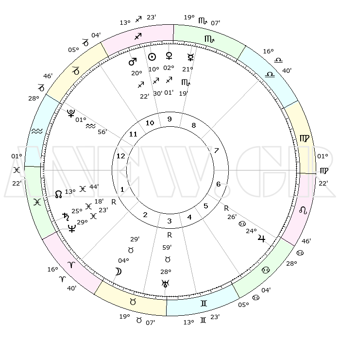 | | ΘΕΣΕΙΣ ΠΛΑΝΗΤΩΝ ΑΣΤΡΟΛΟΓΙΚΟΥ ΧΑΡΤΗ ΤΗΣ ΣΤΙΓΜΗΣ ΑΥΤΗΣ | | | | Πλανήτης | Ζώδιο | Μοίρες | Δεκαήμ. | Σε οίκο | Απόκλιση | | Ακμές των οίκων | | Ηλιος | Τοξότης | 10°28' | Δεύτερο | 10 | 22 S 01 | | 1ος | 13°16' | Υδροχόος | | Σελήνη | Ταύρος | 03°58' | Πρώτο | 2 | 16 N 26 | | 2ος | 28°52' | Ιχθείς | | Ερμής | Σκορπιός | 21°18' | Τρίτο | 9 | 15 S 33 | | 3ος | 04°56' | Ταύρος | | Αφροδίτη | Τοξότης | 01°58' | Πρώτο | 10 | 19 S 55 | | 4ος | 01°19' | Δίδυμοι | | Αρης | Τοξότης | 20°21' | Τρίτο | 10 | 23 S 45 | | 5ος | 23°21' | Δίδυμοι | | Δίας | Καρκίνος | 24°26'R | Τρίτο | 6 | 21 N 23 | | 6ος | 15°28' | Καρκίνος | | Κρόνος | Ιχθείς | 25°18' | Τρίτο | 1 | 04 S 02 | | 7ος | 13°16' | Λέων | | Ουρανός | Ταύρος | 28°59'R | Τρίτο | 3 | 19 N 44 | | 8ος | 28°52' | Παρθένος | | Ποσειδώνας | Ιχθείς | 29°23'R | Τρίτο | 2 | 01 S 29 | | 9ος | 04°56' | Σκορπιός | | Πλούτωνας | Υδροχόος | 01°56' | Πρώτο | 12 | 23 S 24 | | 10ος | 01°19' | Τοξότης | | Β. Δεσμός | Ιχθείς | 13°44' | Δεύτερο | 1 | 06 S 24 | | 11ος | 23°21' | Τοξότης | | Ωροσκόπος | Υδροχόος | 13°16' | Δεύτερο | | | 12ος | 15°28' | Αιγόκερως | | Μεσουράνημα | Τοξότης | 01°19' | Πρώτο | | | |