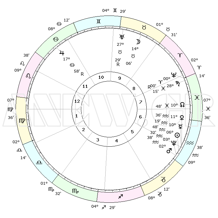 | | ΘΕΣΕΙΣ ΠΛΑΝΗΤΩΝ ΑΣΤΡΟΛΟΓΙΚΟΥ ΧΑΡΤΗ ΤΗΣ ΣΤΙΓΜΗΣ ΑΥΤΗΣ | | | | Πλανήτης | Ζώδιο | Μοίρες | Δεκαήμ. | Σε οίκο | Απόκλιση | | Ακμές των οίκων | | Ηλιος | Υδροχόος | 06°43' | Πρώτο | 6 | 18 S 35 | | 1ος | 14°36' | Λέων | | Σελήνη | Ταύρος | 12°59' | Δεύτερο | 10 | 20 N 10 | | 2ος | 06°52' | Παρθένος | | Ερμής | Υδροχόος | 10°11' | Δεύτερο | 6 | 19 S 41 | | 3ος | 03°51' | Ζυγός | | Αφροδίτη | Υδροχόος | 11°30' | Δεύτερο | 6 | 18 S 33 | | 4ος | 06°15' | Σκορπιός | | Αρης | Υδροχόος | 02°35' | Πρώτο | 6 | 20 S 35 | | 5ος | 11°33' | Τοξότης | | Δίας | Καρκίνος | 17°59'R | Δεύτερο | 12 | 22 N 31 | | 6ος | 15°05' | Αιγόκερως | | Κρόνος | Ιχθείς | 28°15' | Τρίτο | 8 | 02 S 42 | | 7ος | 14°36' | Υδροχόος | | Ουρανός | Ταύρος | 27°29'R | Τρίτο | 10 | 19 N 24 | | 8ος | 06°52' | Ιχθείς | | Ποσειδώνας | Κριός | 00°00'R | Πρώτο | 8 | 01 S 12 | | 9ος | 03°51' | Κριός | | Πλούτωνας | Υδροχόος | 03°32' | Πρώτο | 6 | 23 S 03 | | 10ος | 06°15' | Ταύρος | | Β. Δεσμός | Ιχθείς | 10°49' | Δεύτερο | 8 | 07 S 31 | | 11ος | 11°33' | Δίδυμοι | | Ωροσκόπος | Λέων | 14°36' | Δεύτερο | | | 12ος | 15°05' | Καρκίνος | | Μεσουράνημα | Ταύρος | 06°15' | Πρώτο | | | |