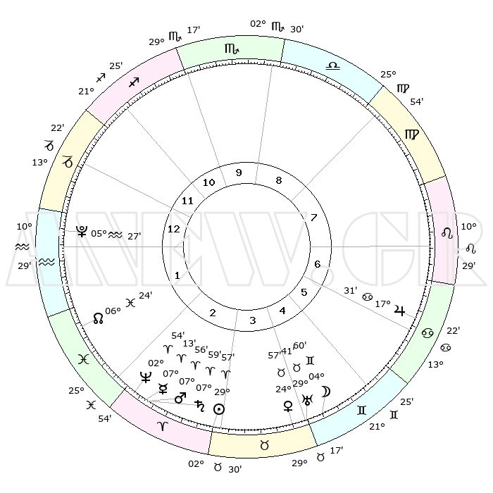 | | ΘΕΣΕΙΣ ΠΛΑΝΗΤΩΝ ΑΣΤΡΟΛΟΓΙΚΟΥ ΧΑΡΤΗ ΤΗΣ ΣΤΙΓΜΗΣ ΑΥΤΗΣ | | | | Πλανήτης | Ζώδιο | Μοίρες | Δεκαήμ. | Σε οίκο | Απόκλιση | | Ακμές των οίκων | | Ηλιος | Κριός | 29°54' | Τρίτο | 3 | 11 N 26 | | 1ος | 19°48' | Αιγόκερως | | Σελήνη | Δίδυμοι | 04°16' | Πρώτο | 4 | 26 N 00 | | 2ος | 01°54' | Ιχθείς | | Ερμής | Κριός | 07°09' | Πρώτο | 2 | 00 N 26 | | 3ος | 11°39' | Κριός | | Αφροδίτη | Ταύρος | 24°54' | Τρίτο | 4 | 19 N 22 | | 4ος | 11°58' | Ταύρος | | Αρης | Κριός | 07°53' | Πρώτο | 2 | 02 N 15 | | 5ος | 05°38' | Δίδυμοι | | Δίας | Καρκίνος | 17°31' | Δεύτερο | 6 | 22 N 40 | | 6ος | 26°50' | Δίδυμοι | | Κρόνος | Κριός | 07°59' | Πρώτο | 2 | 01 N 11 | | 7ος | 19°48' | Καρκίνος | | Ουρανός | Ταύρος | 29°41' | Τρίτο | 4 | 19 N 55 | | 8ος | 01°54' | Παρθένος | | Ποσειδώνας | Κριός | 02°54' | Πρώτο | 2 | 00 S 03 | | 9ος | 11°39' | Ζυγός | | Πλούτωνας | Υδροχόος | 05°27' | Πρώτο | 1 | 22 S 48 | | 10ος | 11°58' | Σκορπιός | | Β. Δεσμός | Ιχθείς | 06°24' | Πρώτο | 2 | 09 S 10 | | 11ος | 05°38' | Τοξότης | | Ωροσκόπος | Αιγόκερως | 19°48' | Δεύτερο | | | 12ος | 26°50' | Τοξότης | | Μεσουράνημα | Σκορπιός | 11°58' | Δεύτερο | | | |