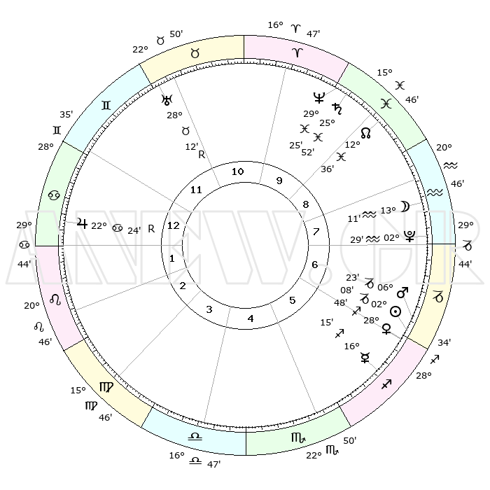 | | ΘΕΣΕΙΣ ΠΛΑΝΗΤΩΝ ΑΣΤΡΟΛΟΓΙΚΟΥ ΧΑΡΤΗ ΤΗΣ ΣΤΙΓΜΗΣ ΑΥΤΗΣ | | | | Πλανήτης | Ζώδιο | Μοίρες | Δεκαήμ. | Σε οίκο | Απόκλιση | | Ακμές των οίκων | | Ηλιος | Αιγόκερως | 02°03' | Πρώτο | 6 | 23 S 25 | | 1ος | 06°51' | Καρκίνος | | Σελήνη | Υδροχόος | 12°15' | Δεύτερο | 8 | 19 S 29 | | 2ος | 27°20' | Καρκίνος | | Ερμής | Τοξότης | 16°08' | Δεύτερο | 6 | 22 S 17 | | 3ος | 19°40' | Λέων | | Αφροδίτη | Τοξότης | 28°42' | Τρίτο | 6 | 23 S 37 | | 4ος | 17°06' | Παρθένος | | Αρης | Αιγόκερως | 06°19' | Πρώτο | 6 | 24 S 07 | | 5ος | 22°01' | Ζυγός | | Δίας | Καρκίνος | 22°24'R | Τρίτο | 1 | 21 N 47 | | 6ος | 01°22' | Τοξότης | | Κρόνος | Ιχθείς | 25°51' | Τρίτο | 10 | 03 S 45 | | 7ος | 06°51' | Αιγόκερως | | Ουρανός | Ταύρος | 28°12'R | Τρίτο | 11 | 19 N 33 | | 8ος | 27°20' | Αιγόκερως | | Ποσειδώνας | Ιχθείς | 29°25' | Τρίτο | 10 | 01 S 27 | | 9ος | 19°40' | Υδροχόος | | Πλούτωνας | Υδροχόος | 02°29' | Πρώτο | 8 | 23 S 16 | | 10ος | 17°06' | Ιχθείς | | Β. Δεσμός | Ιχθείς | 12°37' | Δεύτερο | 9 | 06 S 50 | | 11ος | 22°01' | Κριός | | Ωροσκόπος | Καρκίνος | 06°51' | Πρώτο | | | 12ος | 01°22' | Δίδυμοι | | Μεσουράνημα | Ιχθείς | 17°06' | Δεύτερο | | | |