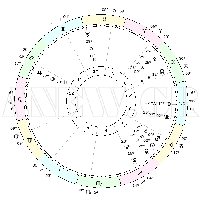 | | ΘΕΣΕΙΣ ΠΛΑΝΗΤΩΝ ΑΣΤΡΟΛΟΓΙΚΟΥ ΧΑΡΤΗ ΤΗΣ ΣΤΙΓΜΗΣ ΑΥΤΗΣ | | | | Πλανήτης | Ζώδιο | Μοίρες | Δεκαήμ. | Σε οίκο | Απόκλιση | | Ακμές των οίκων | | Ηλιος | Αιγόκερως | 02°07' | Πρώτο | 6 | 23 S 25 | | 1ος | 24°26' | Καρκίνος | | Σελήνη | Υδροχόος | 12°58' | Δεύτερο | 7 | 19 S 13 | | 2ος | 15°09' | Λέων | | Ερμής | Τοξότης | 16°14' | Δεύτερο | 5 | 22 S 18 | | 3ος | 09°27' | Παρθένος | | Αφροδίτη | Τοξότης | 28°46' | Τρίτο | 6 | 23 S 37 | | 4ος | 09°44' | Ζυγός | | Αρης | Αιγόκερως | 06°22' | Πρώτο | 6 | 24 S 07 | | 5ος | 15°49' | Σκορπιός | | Δίας | Καρκίνος | 22°24'R | Τρίτο | 12 | 21 N 47 | | 6ος | 22°28' | Τοξότης | | Κρόνος | Ιχθείς | 25°51' | Τρίτο | 9 | 03 S 45 | | 7ος | 24°26' | Αιγόκερως | | Ουρανός | Ταύρος | 28°12'R | Τρίτο | 11 | 19 N 33 | | 8ος | 15°09' | Υδροχόος | | Ποσειδώνας | Ιχθείς | 29°25' | Τρίτο | 9 | 01 S 27 | | 9ος | 09°27' | Ιχθείς | | Πλούτωνας | Υδροχόος | 02°29' | Πρώτο | 7 | 23 S 16 | | 10ος | 09°44' | Κριός | | Β. Δεσμός | Ιχθείς | 12°37' | Δεύτερο | 9 | 06 S 50 | | 11ος | 15°49' | Ταύρος | | Ωροσκόπος | Καρκίνος | 24°26' | Τρίτο | | | 12ος | 22°28' | Δίδυμοι | | Μεσουράνημα | Κριός | 09°44' | Πρώτο | | | |