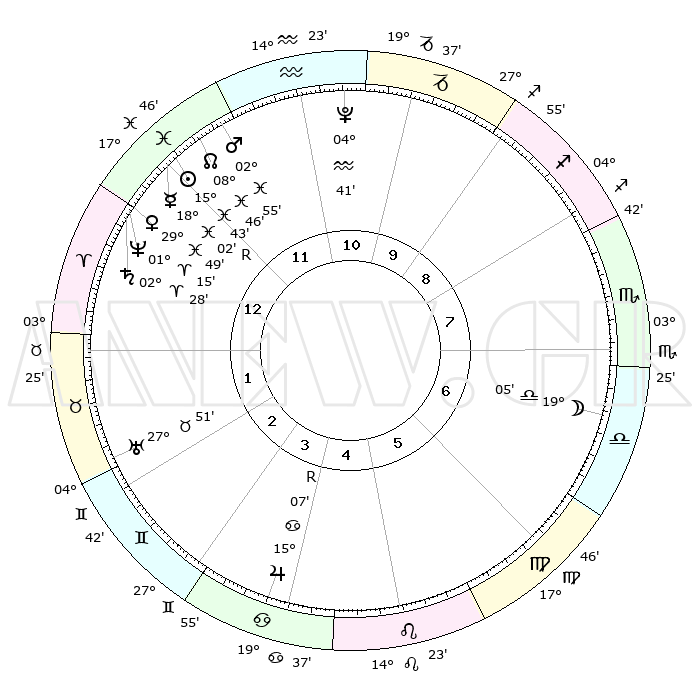 | | ΘΕΣΕΙΣ ΠΛΑΝΗΤΩΝ ΑΣΤΡΟΛΟΓΙΚΟΥ ΧΑΡΤΗ ΤΗΣ ΣΤΙΓΜΗΣ ΑΥΤΗΣ | | | | Πλανήτης | Ζώδιο | Μοίρες | Δεκαήμ. | Σε οίκο | Απόκλιση | | Ακμές των οίκων | | Ηλιος | Ιχθείς | 15°39' | Δεύτερο | 12 | 05 S 39 | | 1ος | 25°23' | Ιχθείς | | Σελήνη | Ζυγός | 18°15' | Δεύτερο | 7 | 10 S 14 | | 2ος | 06°45' | Ταύρος | | Ερμής | Ιχθείς | 18°06'R | Δεύτερο | 12 | 01 S 18 | | 3ος | 04°53' | Δίδυμοι | | Αφροδίτη | Ιχθείς | 29°44' | Τρίτο | 1 | 01 S 16 | | 4ος | 27°24' | Δίδυμοι | | Αρης | Ιχθείς | 02°52' | Πρώτο | 12 | 11 S 28 | | 5ος | 19°31' | Καρκίνος | | Δίας | Καρκίνος | 15°08'R | Δεύτερο | 4 | 22 N 55 | | 6ος | 16°14' | Λέων | | Κρόνος | Κριός | 02°28' | Πρώτο | 1 | 00 S 58 | | 7ος | 25°23' | Παρθένος | | Ουρανός | Ταύρος | 27°51' | Τρίτο | 2 | 19 N 30 | | 8ος | 06°45' | Σκορπιός | | Ποσειδώνας | Κριός | 01°14' | Πρώτο | 1 | 00 S 42 | | 9ος | 04°53' | Τοξότης | | Πλούτωνας | Υδροχόος | 04°40' | Πρώτο | 11 | 22 S 51 | | 10ος | 27°24' | Τοξότης | | Β. Δεσμός | Ιχθείς | 08°46' | Πρώτο | 12 | 08 S 17 | | 11ος | 19°31' | Αιγόκερως | | Ωροσκόπος | Ιχθείς | 25°23' | Τρίτο | | | 12ος | 16°14' | Υδροχόος | | Μεσουράνημα | Τοξότης | 27°24' | Τρίτο | | | |