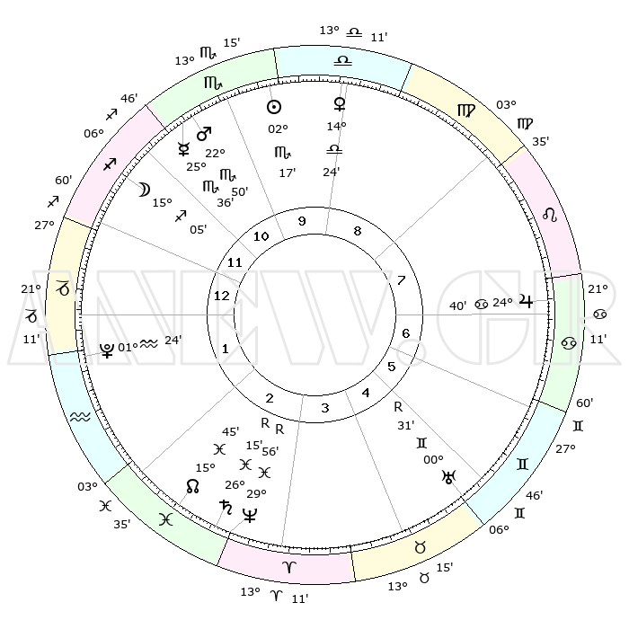 | | ΘΕΣΕΙΣ ΠΛΑΝΗΤΩΝ ΑΣΤΡΟΛΟΓΙΚΟΥ ΧΑΡΤΗ ΤΗΣ ΣΤΙΓΜΗΣ ΑΥΤΗΣ | | | | Πλανήτης | Ζώδιο | Μοίρες | Δεκαήμ. | Σε οίκο | Απόκλιση | | Ακμές των οίκων | | Ηλιος | Σκορπιός | 01°49' | Πρώτο | 3 | 12 S 06 | | 1ος | 29°35' | Λέων | | Σελήνη | Τοξότης | 09°33' | Πρώτο | 4 | 26 S 54 | | 2ος | 23°23' | Παρθένος | | Ερμής | Σκορπιός | 25°03' | Τρίτο | 4 | 21 S 34 | | 3ος | 22°02' | Ζυγός | | Αφροδίτη | Ζυγός | 13°49' | Δεύτερο | 2 | 04 S 02 | | 4ος | 24°56' | Σκορπιός | | Αρης | Σκορπιός | 22°30' | Τρίτο | 3 | 18 S 42 | | 5ος | 29°09' | Τοξότης | | Δίας | Καρκίνος | 24°39' | Τρίτο | 11 | 21 N 15 | | 6ος | 01°09' | Υδροχόος | | Κρόνος | Ιχθείς | 26°17'R | Τρίτο | 8 | 03 S 45 | | 7ος | 29°35' | Υδροχόος | | Ουρανός | Δίδυμοι | 00°32'R | Πρώτο | 10 | 20 N 03 | | 8ος | 23°23' | Ιχθείς | | Ποσειδώνας | Ιχθείς | 29°56'R | Τρίτο | 8 | 01 S 17 | | 9ος | 22°01' | Κριός | | Πλούτωνας | Υδροχόος | 01°24' | Πρώτο | 6 | 23 S 32 | | 10ος | 24°56' | Ταύρος | | Β. Δεσμός | Ιχθείς | 15°46' | Δεύτερο | 7 | 05 S 37 | | 11ος | 29°09' | Δίδυμοι | | Ωροσκόπος | Λέων | 29°35' | Τρίτο | | | 12ος | 01°09' | Λέων | | Μεσουράνημα | Ταύρος | 24°56' | Τρίτο | | | |