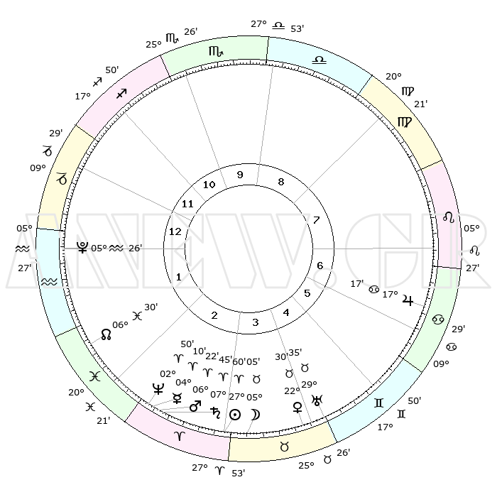 | | ΘΕΣΕΙΣ ΠΛΑΝΗΤΩΝ ΑΣΤΡΟΛΟΓΙΚΟΥ ΧΑΡΤΗ ΤΗΣ ΣΤΙΓΜΗΣ ΑΥΤΗΣ | | | | Πλανήτης | Ζώδιο | Μοίρες | Δεκαήμ. | Σε οίκο | Απόκλιση | | Ακμές των οίκων | | Ηλιος | Κριός | 27°56' | Τρίτο | 3 | 10 N 44 | | 1ος | 13°18' | Αιγόκερως | | Σελήνη | Ταύρος | 04°17' | Πρώτο | 3 | 16 N 57 | | 2ος | 23°50' | Υδροχόος | | Ερμής | Κριός | 04°05' | Πρώτο | 3 | 00 S 48 | | 3ος | 04°02' | Κριός | | Αφροδίτη | Ταύρος | 22°26' | Τρίτο | 4 | 18 N 40 | | 4ος | 05°35' | Ταύρος | | Αρης | Κριός | 06°20' | Πρώτο | 3 | 01 N 37 | | 5ος | 00°00' | Δίδυμοι | | Δίας | Καρκίνος | 17°17' | Δεύτερο | 7 | 22 N 42 | | 6ος | 21°15' | Δίδυμοι | | Κρόνος | Κριός | 07°44' | Πρώτο | 3 | 01 N 06 | | 7ος | 13°18' | Καρκίνος | | Ουρανός | Ταύρος | 29°35' | Τρίτο | 4 | 19 N 53 | | 8ος | 23°50' | Λέων | | Ποσειδώνας | Κριός | 02°50' | Πρώτο | 2 | 00 S 05 | | 9ος | 04°02' | Ζυγός | | Πλούτωνας | Υδροχόος | 05°26' | Πρώτο | 1 | 22 S 47 | | 10ος | 05°35' | Σκορπιός | | Β. Δεσμός | Ιχθείς | 06°30' | Πρώτο | 2 | 09 S 07 | | 11ος | 00°00' | Τοξότης | | Ωροσκόπος | Αιγόκερως | 13°18' | Δεύτερο | | | 12ος | 21°15' | Τοξότης | | Μεσουράνημα | Σκορπιός | 05°35' | Πρώτο | | | |