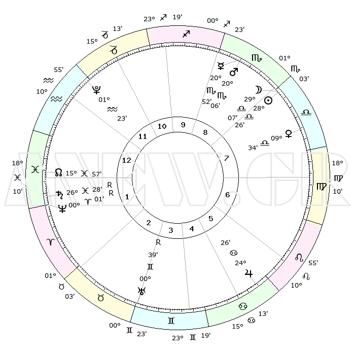 | ΘΕΣΕΙΣ ΠΛΑΝΗΤΩΝ ΑΣΤΡΟΛΟΓΙΚΟΥ ΧΑΡΤΗ ΤΗΣ ΣΤΙΓΜΗΣ ΑΥΤΗΣ | | Πλανήτης | Ζώδιο | Μοίρες | Δεκαήμ. | Σε οίκο | Απόκλιση | | Ακμές των οίκων | Ηλιος | Ζυγός | 28°04' | Τρίτο | 12 | 10 S 47 | | 1ος | 04°49' | Σκορπιός | Σελήνη | Ζυγός | 24°48' | Τρίτο | 12 | 12 S 30 | | 2ος | 03°32' | Τοξότης | Ερμής | Σκορπιός | 20°24' | Τρίτο | 1 | 20 S 06 | | 3ος | 05°54' | Αιγόκερως | Αφροδίτη | Ζυγός | 09°08' | Πρώτο | 11 | 02 S 12 | | 4ος | 10°25' | Υδροχόος | Αρης | Σκορπιός | 19°51' | Δεύτερο | 1 | 17 S 58 | | 5ος | 13°15' | Ιχθείς | Δίας | Καρκίνος | 24°24' | Τρίτο | 9 | 21 N 18 | | 6ος | 11°28' | Κριός | Κρόνος | Ιχθείς | 26°30'R | Τρίτο | 5 | 03 S 41 | | 7ος | 04°49' | Ταύρος | Ουρανός | Δίδυμοι | 00°39'R | Πρώτο | 7 | 20 N 05 | | 8ος | 03°31' | Δίδυμοι | Ποσειδώνας | Κριός | 00°01'R | Πρώτο | 5 | 01 S 15 | | 9ος | 05°54' | Καρκίνος | Πλούτωνας | Υδροχόος | 01°23' | Πρώτο | 3 | 23 S 32 | | 10ος | 10°25' | Λέων | Β. Δεσμός | Ιχθείς | 15°58' | Δεύτερο | 5 | 05 S 32 | | 11ος | 13°15' | Παρθένος | Ωροσκόπος | Σκορπιός | 04°49' | Πρώτο | | | 12ος | 11°28' | Ζυγός | Μεσουράνημα | Λέων | 10°25' | Δεύτερο | | | |