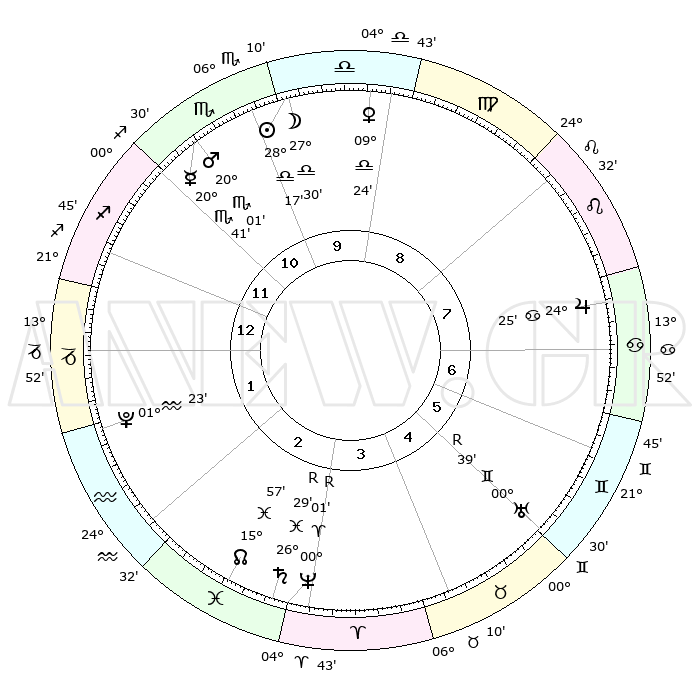 | ΘΕΣΕΙΣ ΠΛΑΝΗΤΩΝ ΑΣΤΡΟΛΟΓΙΚΟΥ ΧΑΡΤΗ ΤΗΣ ΣΤΙΓΜΗΣ ΑΥΤΗΣ | | Πλανήτης | Ζώδιο | Μοίρες | Δεκαήμ. | Σε οίκο | Απόκλιση | | Ακμές των οίκων | Ηλιος | Ζυγός | 27°57' | Τρίτο | 2 | 10 S 44 | | 1ος | 28°34' | Παρθένος | Σελήνη | Ζυγός | 23°20' | Τρίτο | 1 | 11 S 51 | | 2ος | 25°03' | Ζυγός | Ερμής | Σκορπιός | 20°15' | Τρίτο | 2 | 20 S 02 | | 3ος | 25°26' | Σκορπιός | Αφροδίτη | Ζυγός | 08°58' | Πρώτο | 1 | 02 S 09 | | 4ος | 28°24' | Τοξότης | Αρης | Σκορπιός | 19°46' | Δεύτερο | 2 | 17 S 57 | | 5ος | 01°23' | Υδροχόος | Δίας | Καρκίνος | 24°24' | Τρίτο | 10 | 21 N 18 | | 6ος | 01°53' | Ιχθείς | Κρόνος | Ιχθείς | 26°30'R | Τρίτο | 6 | 03 S 41 | | 7ος | 28°34' | Ιχθείς | Ουρανός | Δίδυμοι | 00°40'R | Πρώτο | 9 | 20 N 05 | | 8ος | 25°03' | Κριός | Ποσειδώνας | Κριός | 00°02'R | Πρώτο | 7 | 01 S 15 | | 9ος | 25°26' | Ταύρος | Πλούτωνας | Υδροχόος | 01°23' | Πρώτο | 4 | 23 S 32 | | 10ος | 28°24' | Δίδυμοι | Β. Δεσμός | Ιχθείς | 15°59' | Δεύτερο | 6 | 05 S 32 | | 11ος | 01°23' | Λέων | Ωροσκόπος | Παρθένος | 28°34' | Τρίτο | | | 12ος | 01°53' | Παρθένος | Μεσουράνημα | Δίδυμοι | 28°24' | Τρίτο | | | |