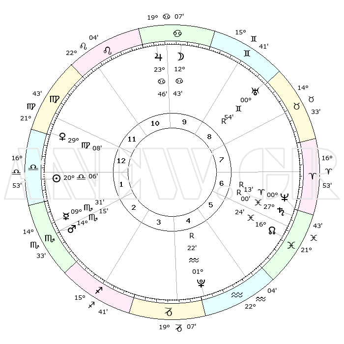 | ΘΕΣΕΙΣ ΠΛΑΝΗΤΩΝ ΑΣΤΡΟΛΟΓΙΚΟΥ ΧΑΡΤΗ ΤΗΣ ΣΤΙΓΜΗΣ ΑΥΤΗΣ | | Πλανήτης | Ζώδιο | Μοίρες | Δεκαήμ. | Σε οίκο | Απόκλιση | | Ακμές των οίκων | Ηλιος | Ζυγός | 19°59' | Δεύτερο | 2 | 07 S 49 | | 1ος | 14°59' | Παρθένος | Σελήνη | Καρκίνος | 11°13' | Δεύτερο | 10 | 27 N 44 | | 2ος | 10°19' | Ζυγός | Ερμής | Σκορπιός | 09°21' | Πρώτο | 2 | 16 S 03 | | 3ος | 10°05' | Σκορπιός | Αφροδίτη | Παρθένος | 29°00' | Τρίτο | 1 | 01 N 46 | | 4ος | 13°01' | Τοξότης | Αρης | Σκορπιός | 14°10' | Δεύτερο | 3 | 16 S 17 | | 5ος | 16°23' | Αιγόκερως | Δίας | Καρκίνος | 23°45' | Τρίτο | 11 | 21 N 23 | | 6ος | 17°25' | Υδροχόος | Κρόνος | Ιχθείς | 27°01'R | Τρίτο | 7 | 03 S 29 | | 7ος | 14°59' | Ιχθείς | Ουρανός | Δίδυμοι | 00°55'R | Πρώτο | 9 | 20 N 08 | | 8ος | 10°20' | Κριός | Ποσειδώνας | Κριός | 00°14'R | Πρώτο | 7 | 01 S 10 | | 9ος | 10°05' | Ταύρος | Πλούτωνας | Υδροχόος | 01°22'R | Πρώτο | 5 | 23 S 32 | | 10ος | 13°01' | Δίδυμοι | Β. Δεσμός | Ιχθείς | 16°24' | Δεύτερο | 7 | 05 S 22 | | 11ος | 16°23' | Καρκίνος | Ωροσκόπος | Παρθένος | 14°59' | Δεύτερο | | | 12ος | 17°25' | Λέων | Μεσουράνημα | Δίδυμοι | 13°01' | Δεύτερο | | | |