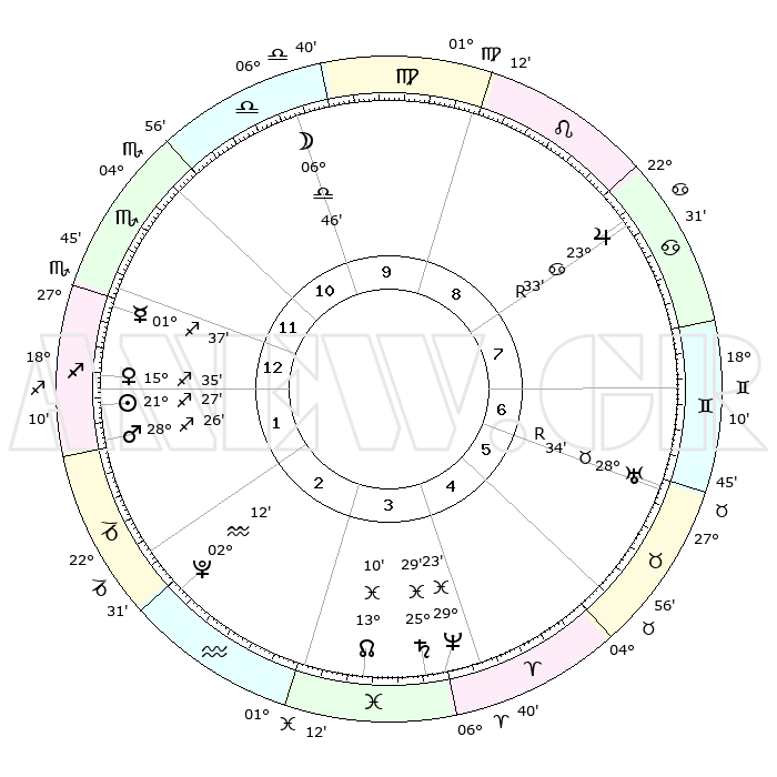 | | ΘΕΣΕΙΣ ΠΛΑΝΗΤΩΝ ΑΣΤΡΟΛΟΓΙΚΟΥ ΧΑΡΤΗ ΤΗΣ ΣΤΙΓΜΗΣ ΑΥΤΗΣ | | | | Πλανήτης | Ζώδιο | Μοίρες | Δεκαήμ. | Σε οίκο | Απόκλιση | | Ακμές των οίκων | | Ηλιος | Τοξότης | 21°01' | Τρίτο | 5 | 23 S 08 | | 1ος | 15°25' | Λέων | | Σελήνη | Ζυγός | 01°39' | Πρώτο | 2 | 02 S 08 | | 2ος | 07°46' | Παρθένος | | Ερμής | Τοξότης | 01°05' | Πρώτο | 4 | 18 S 36 | | 3ος | 04°51' | Ζυγός | | Αφροδίτη | Τοξότης | 15°03' | Δεύτερο | 5 | 22 S 21 | | 4ος | 07°18' | Σκορπιός | | Αρης | Τοξότης | 28°07' | Τρίτο | 5 | 24 S 11 | | 5ος | 12°33' | Τοξότης | | Δίας | Καρκίνος | 23°35'R | Τρίτο | 12 | 21 N 34 | | 6ος | 15°59' | Αιγόκερως | | Κρόνος | Ιχθείς | 25°28' | Τρίτο | 8 | 03 S 56 | | 7ος | 15°25' | Υδροχόος | | Ουρανός | Ταύρος | 28°35'R | Τρίτο | 10 | 19 N 38 | | 8ος | 07°46' | Ιχθείς | | Ποσειδώνας | Ιχθείς | 29°22' | Τρίτο | 8 | 01 S 29 | | 9ος | 04°51' | Κριός | | Πλούτωνας | Υδροχόος | 02°11' | Πρώτο | 6 | 23 S 20 | | 10ος | 07°18' | Ταύρος | | Β. Δεσμός | Ιχθείς | 13°11' | Δεύτερο | 8 | 06 S 36 | | 11ος | 12°33' | Δίδυμοι | | Ωροσκόπος | Λέων | 15°25' | Δεύτερο | | | 12ος | 15°59' | Καρκίνος | | Μεσουράνημα | Ταύρος | 07°18' | Πρώτο | | | |
