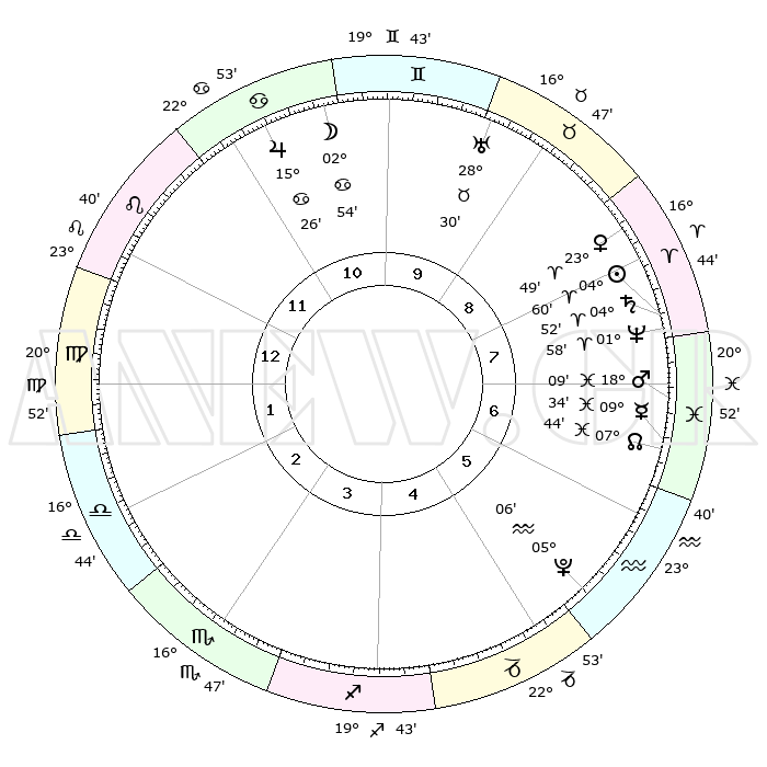 | | ΘΕΣΕΙΣ ΠΛΑΝΗΤΩΝ ΑΣΤΡΟΛΟΓΙΚΟΥ ΧΑΡΤΗ ΤΗΣ ΣΤΙΓΜΗΣ ΑΥΤΗΣ | | | | Πλανήτης | Ζώδιο | Μοίρες | Δεκαήμ. | Σε οίκο | Απόκλιση | | Ακμές των οίκων | | Ηλιος | Κριός | 04°56' | Πρώτο | 8 | 01 N 57 | | 1ος | 29°55' | Λέων | | Σελήνη | Καρκίνος | 01°53' | Πρώτο | 11 | 28 N 14 | | 2ος | 23°45' | Παρθένος | | Ερμής | Ιχθείς | 09°32' | Πρώτο | 7 | 08 S 06 | | 3ος | 22°25' | Ζυγός | | Αφροδίτη | Κριός | 23°44' | Τρίτο | 9 | 08 N 34 | | 4ος | 25°20' | Σκορπιός | | Αρης | Ιχθείς | 18°06' | Δεύτερο | 7 | 05 S 41 | | 5ος | 29°32' | Τοξότης | | Δίας | Καρκίνος | 15°25' | Δεύτερο | 11 | 22 N 54 | | 6ος | 01°30' | Υδροχόος | | Κρόνος | Κριός | 04°52' | Πρώτο | 8 | 00 S 01 | | 7ος | 29°55' | Υδροχόος | | Ουρανός | Ταύρος | 28°30' | Τρίτο | 10 | 19 N 39 | | 8ος | 23°45' | Ιχθείς | | Ποσειδώνας | Κριός | 01°58' | Πρώτο | 8 | 00 S 25 | | 9ος | 22°25' | Κριός | | Πλούτωνας | Υδροχόος | 05°06' | Πρώτο | 6 | 22 S 48 | | 10ος | 25°20' | Ταύρος | | Β. Δεσμός | Ιχθείς | 07°45' | Πρώτο | 7 | 08 S 40 | | 11ος | 29°32' | Δίδυμοι | | Ωροσκόπος | Λέων | 29°55' | Τρίτο | | | 12ος | 01°30' | Λέων | | Μεσουράνημα | Ταύρος | 25°20' | Τρίτο | | | |