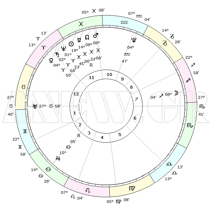 | | ΘΕΣΕΙΣ ΠΛΑΝΗΤΩΝ ΑΣΤΡΟΛΟΓΙΚΟΥ ΧΑΡΤΗ ΤΗΣ ΣΤΙΓΜΗΣ ΑΥΤΗΣ | | | | Πλανήτης | Ζώδιο | Μοίρες | Δεκαήμ. | Σε οίκο | Απόκλιση | | Ακμές των οίκων | | Ηλιος | Ιχθείς | 19°42' | Δεύτερο | 12 | 04 S 05 | | 1ος | 29°59' | Κριός | | Σελήνη | Τοξότης | 07°23' | Πρώτο | 8 | 26 S 44 | | 2ος | 02°12' | Δίδυμοι | | Ερμής | Ιχθείς | 14°04'R | Δεύτερο | 11 | 03 S 11 | | 3ος | 25°46' | Δίδυμοι | | Αφροδίτη | Κριός | 04°46' | Πρώτο | 12 | 00 N 49 | | 4ος | 17°27' | Καρκίνος | | Αρης | Ιχθείς | 06°03' | Πρώτο | 11 | 10 S 18 | | 5ος | 11°51' | Λέων | | Δίας | Καρκίνος | 15°05'R | Δεύτερο | 3 | 22 N 56 | | 6ος | 14°33' | Παρθένος | | Κρόνος | Κριός | 02°58' | Πρώτο | 12 | 00 S 46 | | 7ος | 29°59' | Ζυγός | | Ουρανός | Ταύρος | 27°58' | Τρίτο | 1 | 19 N 32 | | 8ος | 02°12' | Τοξότης | | Ποσειδώνας | Κριός | 01°23' | Πρώτο | 12 | 00 S 39 | | 9ος | 25°46' | Τοξότης | | Πλούτωνας | Υδροχόος | 04°46' | Πρώτο | 10 | 22 S 50 | | 10ος | 17°27' | Αιγόκερως | | Β. Δεσμός | Ιχθείς | 08°33' | Πρώτο | 11 | 08 S 22 | | 11ος | 11°51' | Υδροχόος | | Ωροσκόπος | Κριός | 29°59' | Τρίτο | | | 12ος | 14°33' | Ιχθείς | | Μεσουράνημα | Αιγόκερως | 17°27' | Δεύτερο | | | |