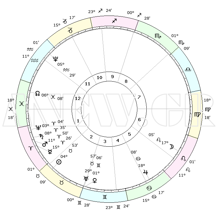 | | ΘΕΣΕΙΣ ΠΛΑΝΗΤΩΝ ΑΣΤΡΟΛΟΓΙΚΟΥ ΧΑΡΤΗ ΤΗΣ ΣΤΙΓΜΗΣ ΑΥΤΗΣ | | | | Πλανήτης | Ζώδιο | Μοίρες | Δεκαήμ. | Σε οίκο | Απόκλιση | | Ακμές των οίκων | | Ηλιος | Ταύρος | 04°50' | Πρώτο | 2 | 13 N 08 | | 1ος | 17°23' | Υδροχόος | | Σελήνη | Λέων | 16°19' | Δεύτερο | 6 | 17 N 42 | | 2ος | 03°09' | Κριός | | Ερμής | Κριός | 15°20' | Δεύτερο | 2 | 03 N 48 | | 3ος | 08°24' | Ταύρος | | Αφροδίτη | Δίδυμοι | 01°02' | Πρώτο | 3 | 20 N 59 | | 4ος | 04°14' | Δίδυμοι | | Αρης | Κριός | 11°47' | Δεύτερο | 2 | 03 N 48 | | 5ος | 26°07' | Δίδυμοι | | Δίας | Καρκίνος | 18°07' | Δεύτερο | 5 | 22 N 35 | | 6ος | 18°32' | Καρκίνος | | Κρόνος | Κριός | 08°35' | Πρώτο | 2 | 01 N 25 | | 7ος | 17°23' | Λέων | | Ουρανός | Ταύρος | 29°57' | Τρίτο | 3 | 19 N 58 | | 8ος | 03°09' | Ζυγός | | Ποσειδώνας | Κριός | 03°04' | Πρώτο | 1 | 00 N 01 | | 9ος | 08°24' | Σκορπιός | | Πλούτωνας | Υδροχόος | 05°29' | Πρώτο | 12 | 22 S 48 | | 10ος | 04°14' | Τοξότης | | Β. Δεσμός | Ιχθείς | 06°08' | Πρώτο | 1 | 09 S 16 | | 11ος | 26°07' | Τοξότης | | Ωροσκόπος | Υδροχόος | 17°23' | Δεύτερο | | | 12ος | 18°32' | Αιγόκερως | | Μεσουράνημα | Τοξότης | 04°14' | Πρώτο | | | |