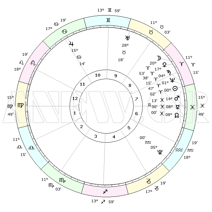 | | ΘΕΣΕΙΣ ΠΛΑΝΗΤΩΝ ΑΣΤΡΟΛΟΓΙΚΟΥ ΧΑΡΤΗ ΤΗΣ ΣΤΙΓΜΗΣ ΑΥΤΗΣ | | | | Πλανήτης | Ζώδιο | Μοίρες | Δεκαήμ. | Σε οίκο | Απόκλιση | | Ακμές των οίκων | | Ηλιος | Ιχθείς | 29°57' | Τρίτο | 8 | 00 S 01 | | 1ος | 23°56' | Λέων | | Σελήνη | Κριός | 19°49' | Δεύτερο | 9 | 10 N 56 | | 2ος | 17°09' | Παρθένος | | Ερμής | Ιχθείς | 08°30'R | Πρώτο | 7 | 07 S 25 | | 3ος | 15°13' | Ζυγός | | Αφροδίτη | Κριός | 17°32' | Δεύτερο | 9 | 06 N 04 | | 4ος | 18°01' | Σκορπιός | | Αρης | Ιχθείς | 14°10' | Δεύτερο | 7 | 07 S 14 | | 5ος | 22°39' | Τοξότης | | Δίας | Καρκίνος | 15°14' | Δεύτερο | 11 | 22 N 55 | | 6ος | 25°08' | Αιγόκερως | | Κρόνος | Κριός | 04°14' | Πρώτο | 8 | 00 S 16 | | 7ος | 23°56' | Υδροχόος | | Ουρανός | Ταύρος | 28°18' | Τρίτο | 10 | 19 N 36 | | 8ος | 17°09' | Ιχθείς | | Ποσειδώνας | Κριός | 01°47' | Πρώτο | 8 | 00 S 30 | | 9ος | 15°13' | Κριός | | Πλούτωνας | Υδροχόος | 05°00' | Πρώτο | 6 | 22 S 49 | | 10ος | 18°01' | Ταύρος | | Β. Δεσμός | Ιχθείς | 08°01' | Πρώτο | 7 | 08 S 34 | | 11ος | 22°39' | Δίδυμοι | | Ωροσκόπος | Λέων | 23°56' | Τρίτο | | | 12ος | 25°08' | Καρκίνος | | Μεσουράνημα | Ταύρος | 18°01' | Δεύτερο | | | |