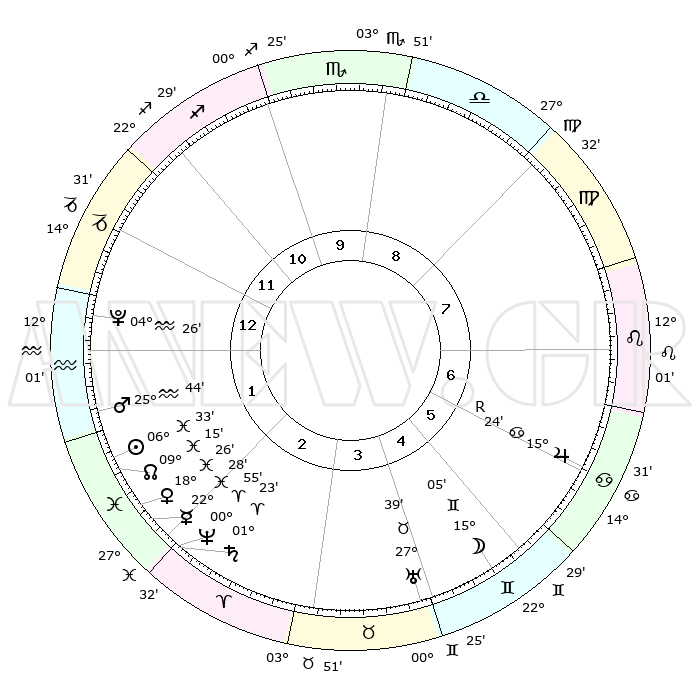 | | ΘΕΣΕΙΣ ΠΛΑΝΗΤΩΝ ΑΣΤΡΟΛΟΓΙΚΟΥ ΧΑΡΤΗ ΤΗΣ ΣΤΙΓΜΗΣ ΑΥΤΗΣ | | | | Πλανήτης | Ζώδιο | Μοίρες | Δεκαήμ. | Σε οίκο | Απόκλιση | | Ακμές των οίκων | | Ηλιος | Ιχθείς | 06°27' | Πρώτο | 2 | 09 S 08 | | 1ος | 02°42' | Αιγόκερως | | Σελήνη | Δίδυμοι | 13°40' | Δεύτερο | 6 | 27 N 39 | | 2ος | 10°32' | Υδροχόος | | Ερμής | Ιχθείς | 22°27' | Τρίτο | 3 | 00 S 41 | | 3ος | 20°42' | Ιχθείς | | Αφροδίτη | Ιχθείς | 18°19' | Δεύτερο | 2 | 05 S 55 | | 4ος | 24°11' | Κριός | | Αρης | Υδροχόος | 25°39' | Τρίτο | 2 | 14 S 00 | | 5ος | 20°05' | Ταύρος | | Δίας | Καρκίνος | 15°24'R | Δεύτερο | 7 | 22 N 53 | | 6ος | 11°43' | Δίδυμοι | | Κρόνος | Κριός | 01°22' | Πρώτο | 3 | 01 S 25 | | 7ος | 02°42' | Καρκίνος | | Ουρανός | Ταύρος | 27°39' | Τρίτο | 5 | 19 N 27 | | 8ος | 10°32' | Λέων | | Ποσειδώνας | Κριός | 00°55' | Πρώτο | 3 | 00 S 50 | | 9ος | 20°42' | Παρθένος | | Πλούτωνας | Υδροχόος | 04°26' | Πρώτο | 1 | 22 S 54 | | 10ος | 24°11' | Ζυγός | | Β. Δεσμός | Ιχθείς | 09°15' | Πρώτο | 2 | 08 S 06 | | 11ος | 20°05' | Σκορπιός | | Ωροσκόπος | Αιγόκερως | 02°42' | Πρώτο | | | 12ος | 11°43' | Τοξότης | | Μεσουράνημα | Ζυγός | 24°11' | Τρίτο | | | |