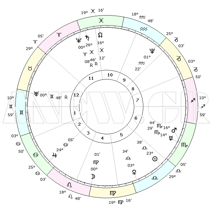 | ΘΕΣΕΙΣ ΠΛΑΝΗΤΩΝ ΑΣΤΡΟΛΟΓΙΚΟΥ ΧΑΡΤΗ ΤΗΣ ΣΤΙΓΜΗΣ ΑΥΤΗΣ | | Πλανήτης | Ζώδιο | Μοίρες | Δεκαήμ. | Σε οίκο | Απόκλιση | | Ακμές των οίκων | Ηλιος | Ζυγός | 23°32' | Τρίτο | 7 | 09 S 08 | | 1ος | 21°07' | Κριός | Σελήνη | Λέων | 28°41' | Τρίτο | 5 | 13 N 33 | | 2ος | 25°49' | Ταύρος | Ερμής | Σκορπιός | 14°21' | Δεύτερο | 7 | 17 S 57 | | 3ος | 20°21' | Δίδυμοι | Αφροδίτη | Ζυγός | 03°26' | Πρώτο | 6 | 00 N 02 | | 4ος | 12°04' | Καρκίνος | Αρης | Σκορπιός | 16°39' | Δεύτερο | 7 | 17 S 02 | | 5ος | 05°40' | Λέων | Δίας | Καρκίνος | 24°04' | Τρίτο | 4 | 21 N 21 | | 6ος | 06°41' | Παρθένος | Κρόνος | Ιχθείς | 26°47'R | Τρίτο | 12 | 03 S 34 | | 7ος | 21°07' | Ζυγός | Ουρανός | Δίδυμοι | 00°48'R | Πρώτο | 2 | 20 N 06 | | 8ος | 25°49' | Σκορπιός | Ποσειδώνας | Κριός | 00°08'R | Πρώτο | 12 | 01 S 12 | | 9ος | 20°21' | Τοξότης | Πλούτωνας | Υδροχόος | 01°22' | Πρώτο | 10 | 23 S 32 | | 10ος | 12°04' | Αιγόκερως | Β. Δεσμός | Ιχθείς | 16°13' | Δεύτερο | 12 | 05 S 26 | | 11ος | 05°40' | Υδροχόος | Ωροσκόπος | Κριός | 21°07' | Τρίτο | | | 12ος | 06°41' | Ιχθείς | Μεσουράνημα | Αιγόκερως | 12°04' | Δεύτερο | | | |