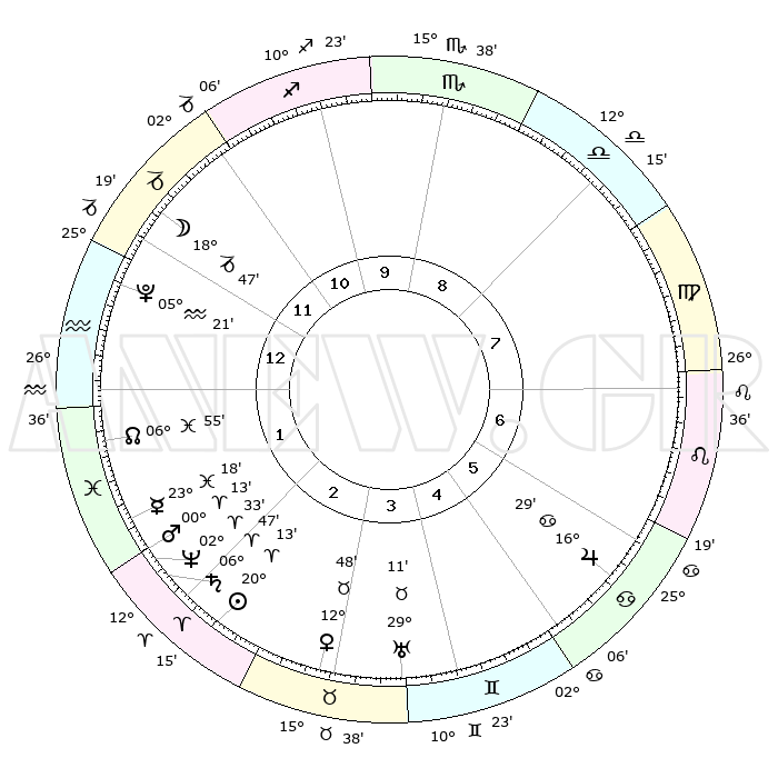 | | ΘΕΣΕΙΣ ΠΛΑΝΗΤΩΝ ΑΣΤΡΟΛΟΓΙΚΟΥ ΧΑΡΤΗ ΤΗΣ ΣΤΙΓΜΗΣ ΑΥΤΗΣ | | | | Πλανήτης | Ζώδιο | Μοίρες | Δεκαήμ. | Σε οίκο | Απόκλιση | | Ακμές των οίκων | | Ηλιος | Κριός | 20°08' | Τρίτο | 3 | 07 N 52 | | 1ος | 19°11' | Αιγόκερως | | Σελήνη | Αιγόκερως | 17°48' | Δεύτερο | 12 | 26 S 12 | | 2ος | 01°08' | Ιχθείς | | Ερμής | Ιχθείς | 23°11' | Τρίτο | 2 | 04 S 51 | | 3ος | 10°56' | Κριός | | Αφροδίτη | Ταύρος | 12°42' | Δεύτερο | 4 | 15 N 35 | | 4ος | 11°22' | Ταύρος | | Αρης | Κριός | 00°09'R | Πρώτο | 2 | 00 S 52 | | 5ος | 05°06' | Δίδυμοι | | Δίας | Καρκίνος | 16°29' | Δεύτερο | 6 | 22 N 47 | | 6ος | 26°19' | Δίδυμοι | | Κρόνος | Κριός | 06°46' | Πρώτο | 2 | 00 N 43 | | 7ος | 19°11' | Καρκίνος | | Ουρανός | Ταύρος | 29°11' | Τρίτο | 4 | 19 N 48 | | 8ος | 01°08' | Παρθένος | | Ποσειδώνας | Κριός | 02°33' | Πρώτο | 2 | 00 S 12 | | 9ος | 10°56' | Ζυγός | | Πλούτωνας | Υδροχόος | 05°21' | Πρώτο | 1 | 22 S 47 | | 10ος | 11°22' | Σκορπιός | | Β. Δεσμός | Ιχθείς | 06°56' | Πρώτο | 2 | 08 S 58 | | 11ος | 05°06' | Τοξότης | | Ωροσκόπος | Αιγόκερως | 19°11' | Δεύτερο | | | 12ος | 26°19' | Τοξότης | | Μεσουράνημα | Σκορπιός | 11°22' | Δεύτερο | | | |