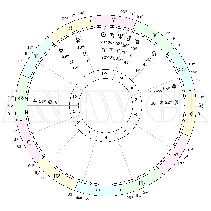 | | ΘΕΣΕΙΣ ΠΛΑΝΗΤΩΝ ΑΣΤΡΟΛΟΓΙΚΟΥ ΧΑΡΤΗ ΤΗΣ ΣΤΙΓΜΗΣ ΑΥΤΗΣ | | | | Πλανήτης | Ζώδιο | Μοίρες | Δεκαήμ. | Σε οίκο | Απόκλιση | | Ακμές των οίκων | | Ηλιος | Κριός | 20°27' | Τρίτο | 11 | 07 N 59 | | 1ος | 26°03' | Δίδυμοι | | Σελήνη | Αιγόκερως | 21°43' | Τρίτο | 8 | 25 S 23 | | 2ος | 17°07' | Καρκίνος | | Ερμής | Ιχθείς | 23°36' | Τρίτο | 10 | 04 S 43 | | 3ος | 08°41' | Λέων | | Αφροδίτη | Ταύρος | 13°06' | Δεύτερο | 11 | 15 N 44 | | 4ος | 04°24' | Παρθένος | | Αρης | Κριός | 00°24' | Πρώτο | 10 | 00 S 46 | | 5ος | 07°40' | Ζυγός | | Δίας | Καρκίνος | 16°31' | Δεύτερο | 1 | 22 N 47 | | 6ος | 17°53' | Σκορπιός | | Κρόνος | Κριός | 06°49' | Πρώτο | 10 | 00 N 44 | | 7ος | 26°03' | Τοξότης | | Ουρανός | Ταύρος | 29°12' | Τρίτο | 12 | 19 N 48 | | 8ος | 17°07' | Αιγόκερως | | Ποσειδώνας | Κριός | 02°33' | Πρώτο | 10 | 00 S 11 | | 9ος | 08°41' | Υδροχόος | | Πλούτωνας | Υδροχόος | 05°21' | Πρώτο | 8 | 22 S 47 | | 10ος | 04°24' | Ιχθείς | | Β. Δεσμός | Ιχθείς | 06°55' | Πρώτο | 10 | 08 S 58 | | 11ος | 07°40' | Κριός | | Ωροσκόπος | Δίδυμοι | 26°03' | Τρίτο | | | 12ος | 17°53' | Ταύρος | | Μεσουράνημα | Ιχθείς | 04°24' | Πρώτο | | | |