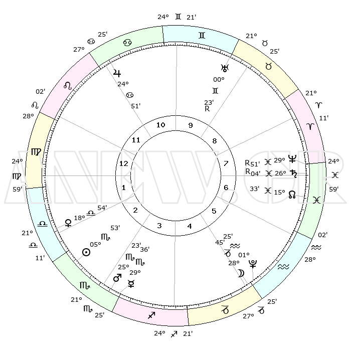 | | ΘΕΣΕΙΣ ΠΛΑΝΗΤΩΝ ΑΣΤΡΟΛΟΓΙΚΟΥ ΧΑΡΤΗ ΤΗΣ ΣΤΙΓΜΗΣ ΑΥΤΗΣ | | | | Πλανήτης | Ζώδιο | Μοίρες | Δεκαήμ. | Σε οίκο | Απόκλιση | | Ακμές των οίκων | | Ηλιος | Σκορπιός | 05°32' | Πρώτο | 6 | 13 S 22 | | 1ος | 05°33' | Δίδυμοι | | Σελήνη | Αιγόκερως | 24°22' | Τρίτο | 9 | 25 S 16 | | 2ος | 29°18' | Δίδυμοι | | Ερμής | Σκορπιός | 29°14' | Τρίτο | 6 | 22 S 44 | | 3ος | 20°34' | Καρκίνος | | Αφροδίτη | Ζυγός | 18°28' | Δεύτερο | 5 | 05 S 51 | | 4ος | 13°47' | Λέων | | Αρης | Σκορπιός | 25°08' | Τρίτο | 6 | 19 S 24 | | 5ος | 13°14' | Παρθένος | | Δίας | Καρκίνος | 24°50' | Τρίτο | 3 | 21 N 14 | | 6ος | 22°29' | Ζυγός | | Κρόνος | Ιχθείς | 26°05'R | Τρίτο | 11 | 03 S 50 | | 7ος | 05°33' | Τοξότης | | Ουρανός | Δίδυμοι | 00°24'R | Πρώτο | 12 | 20 N 01 | | 8ος | 29°18' | Τοξότης | | Ποσειδώνας | Ιχθείς | 29°51'R | Τρίτο | 11 | 01 S 19 | | 9ος | 20°34' | Αιγόκερως | | Πλούτωνας | Υδροχόος | 01°25' | Πρώτο | 9 | 23 S 31 | | 10ος | 13°47' | Υδροχόος | | Β. Δεσμός | Ιχθείς | 15°34' | Δεύτερο | 11 | 05 S 41 | | 11ος | 13°14' | Ιχθείς | | Ωροσκόπος | Δίδυμοι | 05°33' | Πρώτο | | | 12ος | 22°29' | Κριός | | Μεσουράνημα | Υδροχόος | 13°47' | Δεύτερο | | | |