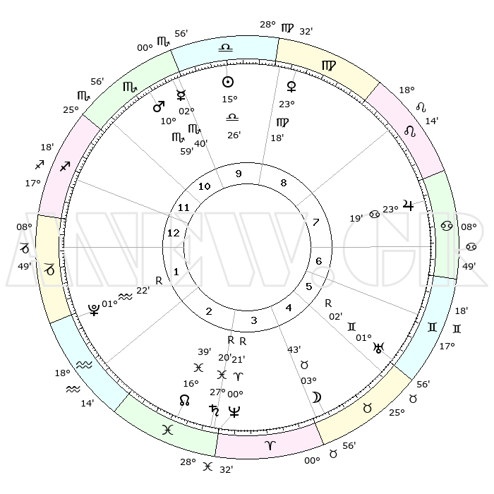 | ΘΕΣΕΙΣ ΠΛΑΝΗΤΩΝ ΑΣΤΡΟΛΟΓΙΚΟΥ ΧΑΡΤΗ ΤΗΣ ΣΤΙΓΜΗΣ ΑΥΤΗΣ | | Πλανήτης | Ζώδιο | Μοίρες | Δεκαήμ. | Σε οίκο | Απόκλιση | | Ακμές των οίκων | Ηλιος | Ζυγός | 15°20' | Δεύτερο | 10 | 06 S 02 | | 1ος | 07°45' | Τοξότης | Σελήνη | Ταύρος | 02°15' | Πρώτο | 5 | 15 N 39 | | 2ος | 10°05' | Αιγόκερως | Ερμής | Σκορπιός | 02°31' | Πρώτο | 11 | 13 S 16 | | 3ος | 17°05' | Υδροχόος | Αφροδίτη | Παρθένος | 23°10' | Τρίτο | 10 | 04 N 02 | | 4ος | 23°09' | Ιχθείς | Αρης | Σκορπιός | 10°55' | Δεύτερο | 11 | 15 S 15 | | 5ος | 23°06' | Κριός | Δίας | Καρκίνος | 23°18' | Τρίτο | 8 | 21 N 27 | | 6ος | 17°08' | Ταύρος | Κρόνος | Ιχθείς | 27°21'R | Τρίτο | 4 | 03 S 21 | | 7ος | 07°45' | Δίδυμοι | Ουρανός | Δίδυμοι | 01°02'R | Πρώτο | 6 | 20 N 09 | | 8ος | 10°05' | Καρκίνος | Ποσειδώνας | Κριός | 00°21'R | Πρώτο | 4 | 01 S 07 | | 9ος | 17°05' | Λέων | Πλούτωνας | Υδροχόος | 01°22'R | Πρώτο | 2 | 23 S 32 | | 10ος | 23°09' | Παρθένος | Β. Δεσμός | Ιχθείς | 16°39' | Δεύτερο | 3 | 05 S 16 | | 11ος | 23°06' | Ζυγός | Ωροσκόπος | Τοξότης | 07°45' | Πρώτο | | | 12ος | 17°08' | Σκορπιός | Μεσουράνημα | Παρθένος | 23°09' | Τρίτο | | | |
