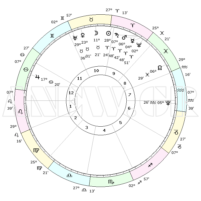| | ΘΕΣΕΙΣ ΠΛΑΝΗΤΩΝ ΑΣΤΡΟΛΟΓΙΚΟΥ ΧΑΡΤΗ ΤΗΣ ΣΤΙΓΜΗΣ ΑΥΤΗΣ | | | | Πλανήτης | Ζώδιο | Μοίρες | Δεκαήμ. | Σε οίκο | Απόκλιση | | Ακμές των οίκων | | Ηλιος | Κριός | 28°21' | Τρίτο | 10 | 10 N 53 | | 1ος | 18°26' | Καρκίνος | | Σελήνη | Ταύρος | 10°23' | Δεύτερο | 11 | 19 N 14 | | 2ος | 08°56' | Λέων | | Ερμής | Κριός | 04°42' | Πρώτο | 10 | 00 S 33 | | 3ος | 02°29' | Παρθένος | | Αφροδίτη | Ταύρος | 22°56' | Τρίτο | 11 | 18 N 49 | | 4ος | 01°51' | Ζυγός | | Αρης | Κριός | 06°39' | Πρώτο | 10 | 01 N 45 | | 5ος | 07°46' | Σκορπιός | | Δίας | Καρκίνος | 17°20' | Δεύτερο | 12 | 22 N 41 | | 6ος | 15°25' | Τοξότης | | Κρόνος | Κριός | 07°47' | Πρώτο | 10 | 01 N 07 | | 7ος | 18°26' | Αιγόκερως | | Ουρανός | Ταύρος | 29°36' | Τρίτο | 11 | 19 N 54 | | 8ος | 08°56' | Υδροχόος | | Ποσειδώνας | Κριός | 02°51' | Πρώτο | 10 | 00 S 05 | | 9ος | 02°29' | Ιχθείς | | Πλούτωνας | Υδροχόος | 05°26' | Πρώτο | 7 | 22 S 47 | | 10ος | 01°51' | Κριός | | Β. Δεσμός | Ιχθείς | 06°29' | Πρώτο | 9 | 09 S 08 | | 11ος | 07°46' | Ταύρος | | Ωροσκόπος | Καρκίνος | 18°26' | Δεύτερο | | | 12ος | 15°25' | Δίδυμοι | | Μεσουράνημα | Κριός | 01°51' | Πρώτο | | | |