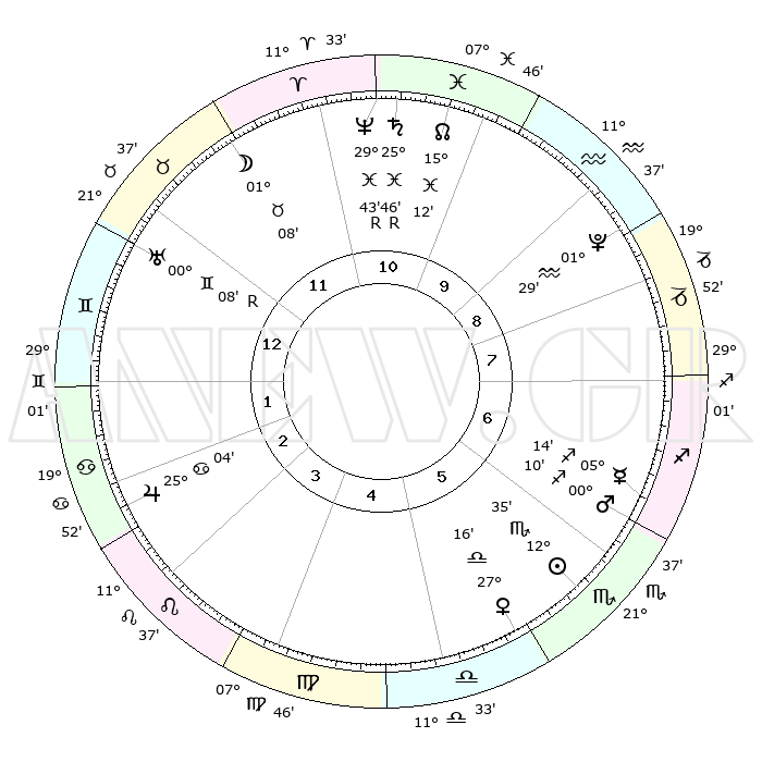 |  | ΘΕΣΕΙΣ ΠΛΑΝΗΤΩΝ ΑΣΤΡΟΛΟΓΙΚΟΥ ΧΑΡΤΗ ΤΗΣ ΣΤΙΓΜΗΣ ΑΥΤΗΣ |  |   |  | Πλανήτης | Ζώδιο | Μοίρες | Δεκαήμ. | Σε οίκο | Απόκλιση |   | Ακμές των οίκων |  | Ηλιος | Σκορπιός | 12°25' | Δεύτερο | 7 | 15 S 33 |   | 1ος | 15°52' | Κριός |  | Σελήνη | Κριός | 28°38' | Τρίτο | 1 | 14 N 09 |   | 2ος | 22°01' | Ταύρος |  | Ερμής | Τοξότης | 05°08' | Πρώτο | 8 | 23 S 57 |   | 3ος | 17°11' | Δίδυμοι |  | Αφροδίτη | Ζυγός | 27°04' | Τρίτο | 7 | 09 S 06 |   | 4ος | 08°59' | Καρκίνος |  | Αρης | Τοξότης | 00°03' | Πρώτο | 8 | 20 S 34 |   | 5ος | 02°12' | Λέων |  | Δίας | Καρκίνος | 25°04' | Τρίτο | 4 | 21 N 12 |   | 6ος | 02°14' | Παρθένος |  | Κρόνος | Ιχθείς | 25°46'R | Τρίτο | 12 | 03 S 56 |   | 7ος | 15°52' | Ζυγός |  | Ουρανός | Δίδυμοι | 00°08'R | Πρώτο | 2 | 19 N 58 |   | 8ος | 22°01' | Σκορπιός |  | Ποσειδώνας | Ιχθείς | 29°43'R | Τρίτο | 12 | 01 S 22 |   | 9ος | 17°11' | Τοξότης |  | Πλούτωνας | Υδροχόος | 01°29' | Πρώτο | 10 | 23 S 30 |   | 10ος | 08°59' | Αιγόκερως |  | Β. Δεσμός | Ιχθείς | 15°13' | Δεύτερο | 12 | 05 S 50 |   | 11ος | 02°12' | Υδροχόος |  | Ωροσκόπος | Κριός | 15°52' | Δεύτερο |   |   | 12ος | 02°14' | Ιχθείς |  | Μεσουράνημα | Αιγόκερως | 08°59' | Πρώτο |   |   |   |