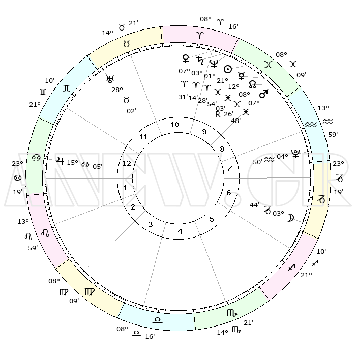 | | ΘΕΣΕΙΣ ΠΛΑΝΗΤΩΝ ΑΣΤΡΟΛΟΓΙΚΟΥ ΧΑΡΤΗ ΤΗΣ ΣΤΙΓΜΗΣ ΑΥΤΗΣ | | | | Πλανήτης | Ζώδιο | Μοίρες | Δεκαήμ. | Σε οίκο | Απόκλιση | | Ακμές των οίκων | | Ηλιος | Ιχθείς | 21°51' | Τρίτο | 10 | 03 S 14 | | 1ος | 04°46' | Καρκίνος | | Σελήνη | Αιγόκερως | 03°00' | Πρώτο | 6 | 28 S 13 | | 2ος | 25°19' | Καρκίνος | | Ερμής | Ιχθείς | 12°06'R | Δεύτερο | 9 | 04 S 16 | | 3ος | 17°28' | Λέων | | Αφροδίτη | Κριός | 07°26' | Πρώτο | 10 | 01 N 55 | | 4ος | 14°34' | Παρθένος | | Αρης | Ιχθείς | 07°45' | Πρώτο | 9 | 09 S 40 | | 5ος | 19°12' | Ζυγός | | Δίας | Καρκίνος | 15°05' | Δεύτερο | 1 | 22 N 56 | | 6ος | 28°47' | Σκορπιός | | Κρόνος | Κριός | 03°14' | Πρώτο | 10 | 00 S 40 | | 7ος | 04°46' | Αιγόκερως | | Ουρανός | Ταύρος | 28°02' | Τρίτο | 11 | 19 N 33 | | 8ος | 25°19' | Αιγόκερως | | Ποσειδώνας | Κριός | 01°28' | Πρώτο | 10 | 00 S 37 | | 9ος | 17°28' | Υδροχόος | | Πλούτωνας | Υδροχόος | 04°50' | Πρώτο | 8 | 22 S 50 | | 10ος | 14°34' | Ιχθείς | | Β. Δεσμός | Ιχθείς | 08°26' | Πρώτο | 9 | 08 S 24 | | 11ος | 19°12' | Κριός | | Ωροσκόπος | Καρκίνος | 04°46' | Πρώτο | | | 12ος | 28°47' | Ταύρος | | Μεσουράνημα | Ιχθείς | 14°34' | Δεύτερο | | | |