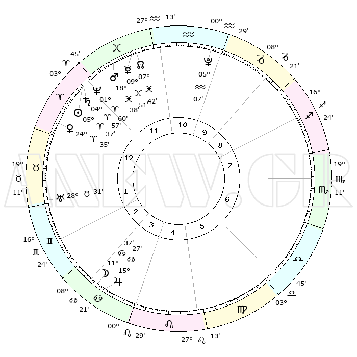 | | ΘΕΣΕΙΣ ΠΛΑΝΗΤΩΝ ΑΣΤΡΟΛΟΓΙΚΟΥ ΧΑΡΤΗ ΤΗΣ ΣΤΙΓΜΗΣ ΑΥΤΗΣ | | | | Πλανήτης | Ζώδιο | Μοίρες | Δεκαήμ. | Σε οίκο | Απόκλιση | | Ακμές των οίκων | | Ηλιος | Κριός | 05°33' | Πρώτο | 12 | 02 N 12 | | 1ος | 17°59' | Κριός | | Σελήνη | Καρκίνος | 10°47' | Δεύτερο | 4 | 27 N 25 | | 2ος | 23°33' | Ταύρος | | Ερμής | Ιχθείς | 09°49' | Πρώτο | 12 | 08 S 07 | | 3ος | 18°28' | Δίδυμοι | | Αφροδίτη | Κριός | 24°30' | Τρίτο | 1 | 08 N 52 | | 4ος | 10°13' | Καρκίνος | | Αρης | Ιχθείς | 18°35' | Δεύτερο | 12 | 05 S 29 | | 5ος | 03°35' | Λέων | | Δίας | Καρκίνος | 15°27' | Δεύτερο | 4 | 22 N 54 | | 6ος | 04°00' | Παρθένος | | Κρόνος | Κριός | 04°56' | Πρώτο | 12 | 00 N 01 | | 7ος | 17°59' | Ζυγός | | Ουρανός | Ταύρος | 28°31' | Τρίτο | 2 | 19 N 39 | | 8ος | 23°33' | Σκορπιός | | Ποσειδώνας | Κριός | 01°59' | Πρώτο | 12 | 00 S 24 | | 9ος | 18°28' | Τοξότης | | Πλούτωνας | Υδροχόος | 05°07' | Πρώτο | 11 | 22 S 48 | | 10ος | 10°13' | Αιγόκερως | | Β. Δεσμός | Ιχθείς | 07°43' | Πρώτο | 12 | 08 S 41 | | 11ος | 03°35' | Υδροχόος | | Ωροσκόπος | Κριός | 17°59' | Δεύτερο | | | 12ος | 04°00' | Ιχθείς | | Μεσουράνημα | Αιγόκερως | 10°13' | Δεύτερο | | | |