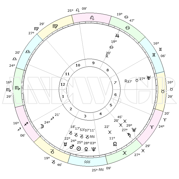| | ΘΕΣΕΙΣ ΠΛΑΝΗΤΩΝ ΑΣΤΡΟΛΟΓΙΚΟΥ ΧΑΡΤΗ ΤΗΣ ΣΤΙΓΜΗΣ ΑΥΤΗΣ | | | | Πλανήτης | Ζώδιο | Μοίρες | Δεκαήμ. | Σε οίκο | Απόκλιση | | Ακμές των οίκων | | Ηλιος | Αιγόκερως | 25°48' | Τρίτο | 3 | 20 S 59 | | 1ος | 26°08' | Ζυγός | | Σελήνη | Τοξότης | 23°30' | Τρίτο | 2 | 28 S 15 | | 2ος | 24°19' | Σκορπιός | | Ερμής | Αιγόκερως | 22°12' | Τρίτο | 3 | 23 S 25 | | 3ος | 25°60' | Τοξότης | | Αφροδίτη | Αιγόκερως | 28°02' | Τρίτο | 3 | 21 S 32 | | 4ος | 29°56' | Αιγόκερως | | Αρης | Αιγόκερως | 24°14' | Τρίτο | 3 | 22 S 13 | | 5ος | 02°53' | Ιχθείς | | Δίας | Καρκίνος | 19°21'R | Δεύτερο | 9 | 22 N 18 | | 6ος | 01°53' | Κριός | | Κρόνος | Ιχθείς | 27°19' | Τρίτο | 5 | 03 S 06 | | 7ος | 26°08' | Κριός | | Ουρανός | Ταύρος | 27°37'R | Τρίτο | 8 | 19 N 26 | | 8ος | 24°19' | Ταύρος | | Ποσειδώνας | Ιχθείς | 29°45' | Τρίτο | 5 | 01 S 19 | | 9ος | 25°60' | Δίδυμοι | | Πλούτωνας | Υδροχόος | 03°11' | Πρώτο | 4 | 23 S 07 | | 10ος | 29°56' | Καρκίνος | | Β. Δεσμός | Ιχθείς | 11°23' | Δεύτερο | 5 | 07 S 18 | | 11ος | 02°53' | Παρθένος | | Ωροσκόπος | Ζυγός | 26°08' | Τρίτο | | | 12ος | 01°53' | Ζυγός | | Μεσουράνημα | Καρκίνος | 29°56' | Τρίτο | | | |