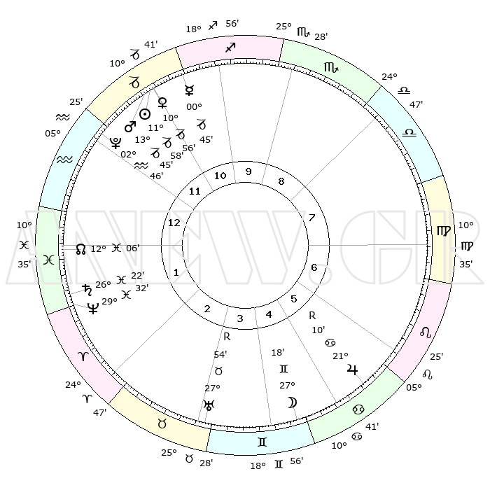 | | ΘΕΣΕΙΣ ΠΛΑΝΗΤΩΝ ΑΣΤΡΟΛΟΓΙΚΟΥ ΧΑΡΤΗ ΤΗΣ ΣΤΙΓΜΗΣ ΑΥΤΗΣ | | | | Πλανήτης | Ζώδιο | Μοίρες | Δεκαήμ. | Σε οίκο | Απόκλιση | | Ακμές των οίκων | | Ηλιος | Αιγόκερως | 11°54' | Δεύτερο | 12 | 22 S 54 | | 1ος | 05°13' | Υδροχόος | | Σελήνη | Δίδυμοι | 26°15' | Τρίτο | 5 | 28 N 16 | | 2ος | 20°05' | Ιχθείς | | Ερμής | Αιγόκερως | 00°39' | Πρώτο | 11 | 24 S 09 | | 3ος | 27°39' | Κριός | | Αφροδίτη | Αιγόκερως | 10°51' | Δεύτερο | 12 | 23 S 32 | | 4ος | 25°15' | Ταύρος | | Αρης | Αιγόκερως | 13°42' | Δεύτερο | 12 | 23 S 37 | | 5ος | 17°40' | Δίδυμοι | | Δίας | Καρκίνος | 21°11'R | Τρίτο | 6 | 22 N 00 | | 6ος | 09°18' | Καρκίνος | | Κρόνος | Ιχθείς | 26°22' | Τρίτο | 2 | 03 S 31 | | 7ος | 05°13' | Λέων | | Ουρανός | Ταύρος | 27°55'R | Τρίτο | 4 | 19 N 30 | | 8ος | 20°05' | Παρθένος | | Ποσειδώνας | Ιχθείς | 29°31' | Τρίτο | 2 | 01 S 25 | | 9ος | 27°39' | Ζυγός | | Πλούτωνας | Υδροχόος | 02°46' | Πρώτο | 12 | 23 S 13 | | 10ος | 25°15' | Σκορπιός | | Β. Δεσμός | Ιχθείς | 12°06' | Δεύτερο | 1 | 07 S 01 | | 11ος | 17°40' | Τοξότης | | Ωροσκόπος | Υδροχόος | 05°13' | Πρώτο | | | 12ος | 09°18' | Αιγόκερως | | Μεσουράνημα | Σκορπιός | 25°15' | Τρίτο | | | |