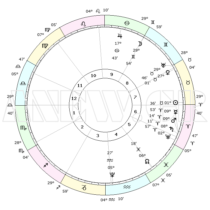 | | ΘΕΣΕΙΣ ΠΛΑΝΗΤΩΝ ΑΣΤΡΟΛΟΓΙΚΟΥ ΧΑΡΤΗ ΤΗΣ ΣΤΙΓΜΗΣ ΑΥΤΗΣ | | | | Πλανήτης | Ζώδιο | Μοίρες | Δεκαήμ. | Σε οίκο | Απόκλιση | | Ακμές των οίκων | | Ηλιος | Ταύρος | 01°33' | Πρώτο | 7 | 12 N 00 | | 1ος | 11°47' | Ζυγός | | Σελήνη | Δίδυμοι | 29°01' | Τρίτο | 9 | 28 N 10 | | 2ος | 09°08' | Σκορπιός | | Ερμής | Κριός | 09°47' | Πρώτο | 6 | 01 N 30 | | 3ος | 10°02' | Τοξότης | | Αφροδίτη | Ταύρος | 26°56' | Τρίτο | 8 | 19 N 56 | | 4ος | 13°17' | Αιγόκερως | | Αρης | Κριός | 09°11' | Πρώτο | 6 | 02 N 46 | | 5ος | 16°13' | Υδροχόος | | Δίας | Καρκίνος | 17°42' | Δεύτερο | 10 | 22 N 39 | | 6ος | 16°08' | Ιχθείς | | Κρόνος | Κριός | 08°11' | Πρώτο | 6 | 01 N 16 | | 7ος | 11°47' | Κριός | | Ουρανός | Ταύρος | 29°46' | Τρίτο | 8 | 19 N 56 | | 8ος | 09°08' | Ταύρος | | Ποσειδώνας | Κριός | 02°57' | Πρώτο | 6 | 00 S 02 | | 9ος | 10°02' | Δίδυμοι | | Πλούτωνας | Υδροχόος | 05°27' | Πρώτο | 4 | 22 S 48 | | 10ος | 13°17' | Καρκίνος | | Β. Δεσμός | Ιχθείς | 06°19' | Πρώτο | 5 | 09 S 12 | | 11ος | 16°13' | Λέων | | Ωροσκόπος | Ζυγός | 11°47' | Δεύτερο | | | 12ος | 16°08' | Παρθένος | | Μεσουράνημα | Καρκίνος | 13°17' | Δεύτερο | | | |