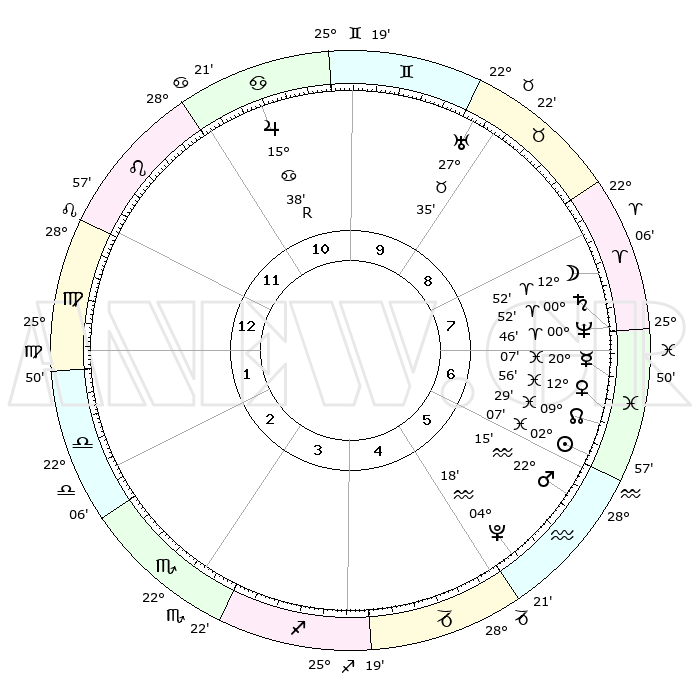 | | ΘΕΣΕΙΣ ΠΛΑΝΗΤΩΝ ΑΣΤΡΟΛΟΓΙΚΟΥ ΧΑΡΤΗ ΤΗΣ ΣΤΙΓΜΗΣ ΑΥΤΗΣ | | | | Πλανήτης | Ζώδιο | Μοίρες | Δεκαήμ. | Σε οίκο | Απόκλιση | | Ακμές των οίκων | | Ηλιος | Ιχθείς | 02°03' | Πρώτο | 6 | 10 S 45 | | 1ος | 05°13' | Παρθένος | | Σελήνη | Κριός | 11°53' | Δεύτερο | 8 | 07 N 21 | | 2ος | 29°37' | Παρθένος | | Ερμής | Ιχθείς | 20°03' | Τρίτο | 7 | 02 S 38 | | 3ος | 28°44' | Ζυγός | | Αφροδίτη | Ιχθείς | 12°50' | Δεύτερο | 7 | 08 S 04 | | 4ος | 01°41' | Τοξότης | | Αρης | Υδροχόος | 22°12' | Τρίτο | 6 | 15 S 08 | | 5ος | 05°32' | Αιγόκερως | | Δίας | Καρκίνος | 15°38'R | Δεύτερο | 11 | 22 N 51 | | 6ος | 07°07' | Υδροχόος | | Κρόνος | Κριός | 00°52' | Πρώτο | 8 | 01 S 37 | | 7ος | 05°14' | Ιχθείς | | Ουρανός | Ταύρος | 27°35' | Τρίτο | 9 | 19 N 26 | | 8ος | 29°37' | Ιχθείς | | Ποσειδώνας | Κριός | 00°45' | Πρώτο | 8 | 00 S 54 | | 9ος | 28°44' | Κριός | | Πλούτωνας | Υδροχόος | 04°18' | Πρώτο | 5 | 22 S 55 | | 10ος | 01°41' | Δίδυμοι | | Β. Δεσμός | Ιχθείς | 09°29' | Πρώτο | 7 | 08 S 01 | | 11ος | 05°32' | Καρκίνος | | Ωροσκόπος | Παρθένος | 05°13' | Πρώτο | | | 12ος | 07°07' | Λέων | | Μεσουράνημα | Δίδυμοι | 01°41' | Πρώτο | | | |