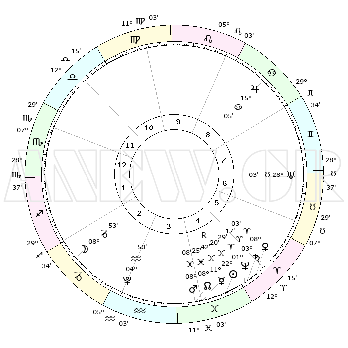 | | ΘΕΣΕΙΣ ΠΛΑΝΗΤΩΝ ΑΣΤΡΟΛΟΓΙΚΟΥ ΧΑΡΤΗ ΤΗΣ ΣΤΙΓΜΗΣ ΑΥΤΗΣ | | | | Πλανήτης | Ζώδιο | Μοίρες | Δεκαήμ. | Σε οίκο | Απόκλιση | | Ακμές των οίκων | | Ηλιος | Ιχθείς | 22°12' | Τρίτο | 5 | 03 S 06 | | 1ος | 20°17' | Ζυγός | | Σελήνη | Αιγόκερως | 07°18' | Πρώτο | 3 | 27 S 52 | | 2ος | 18°08' | Σκορπιός | | Ερμής | Ιχθείς | 11°48'R | Δεύτερο | 5 | 04 S 27 | | 3ος | 19°27' | Τοξότης | | Αφροδίτη | Κριός | 07°53' | Πρώτο | 6 | 02 N 06 | | 4ος | 23°03' | Αιγόκερως | | Αρης | Ιχθείς | 08°02' | Πρώτο | 5 | 09 S 34 | | 5ος | 26°00' | Υδροχόος | | Δίας | Καρκίνος | 15°05' | Δεύτερο | 9 | 22 N 56 | | 6ος | 25°26' | Ιχθείς | | Κρόνος | Κριός | 03°16' | Πρώτο | 6 | 00 S 39 | | 7ος | 20°17' | Κριός | | Ουρανός | Ταύρος | 28°03' | Τρίτο | 8 | 19 N 33 | | 8ος | 18°08' | Ταύρος | | Ποσειδώνας | Κριός | 01°29' | Πρώτο | 6 | 00 S 37 | | 9ος | 19°27' | Δίδυμοι | | Πλούτωνας | Υδροχόος | 04°50' | Πρώτο | 4 | 22 S 50 | | 10ος | 23°03' | Καρκίνος | | Β. Δεσμός | Ιχθείς | 08°25' | Πρώτο | 5 | 08 S 25 | | 11ος | 26°00' | Λέων | | Ωροσκόπος | Ζυγός | 20°17' | Τρίτο | | | 12ος | 25°26' | Παρθένος | | Μεσουράνημα | Καρκίνος | 23°03' | Τρίτο | | | |
