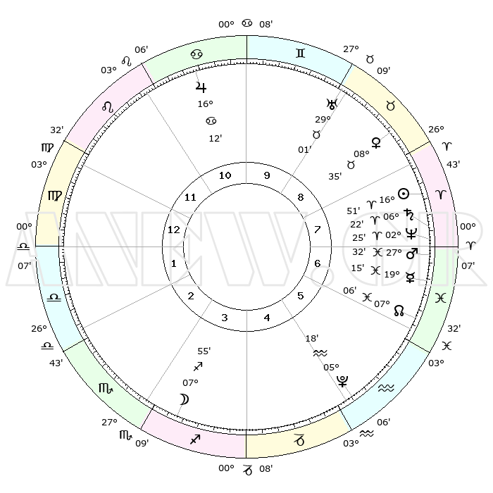 | | ΘΕΣΕΙΣ ΠΛΑΝΗΤΩΝ ΑΣΤΡΟΛΟΓΙΚΟΥ ΧΑΡΤΗ ΤΗΣ ΣΤΙΓΜΗΣ ΑΥΤΗΣ | | | | Πλανήτης | Ζώδιο | Μοίρες | Δεκαήμ. | Σε οίκο | Απόκλιση | | Ακμές των οίκων | | Ηλιος | Κριός | 16°47' | Δεύτερο | 8 | 06 N 36 | | 1ος | 12°44' | Παρθένος | | Σελήνη | Τοξότης | 07°13' | Πρώτο | 3 | 26 S 36 | | 2ος | 07°52' | Ζυγός | | Ερμής | Ιχθείς | 19°12' | Δεύτερο | 7 | 06 S 09 | | 3ος | 07°30' | Σκορπιός | | Αφροδίτη | Ταύρος | 08°31' | Πρώτο | 9 | 14 N 09 | | 4ος | 10°27' | Τοξότης | | Αρης | Ιχθείς | 27°29' | Τρίτο | 7 | 01 S 56 | | 5ος | 13°54' | Αιγόκερως | | Δίας | Καρκίνος | 16°11' | Δεύτερο | 11 | 22 N 49 | | 6ος | 15°03' | Υδροχόος | | Κρόνος | Κριός | 06°21' | Πρώτο | 7 | 00 N 34 | | 7ος | 12°44' | Ιχθείς | | Ουρανός | Ταύρος | 29°01' | Τρίτο | 9 | 19 N 46 | | 8ος | 07°52' | Κριός | | Ποσειδώνας | Κριός | 02°25' | Πρώτο | 7 | 00 S 14 | | 9ος | 07°30' | Ταύρος | | Πλούτωνας | Υδροχόος | 05°18' | Πρώτο | 5 | 22 S 47 | | 10ος | 10°27' | Δίδυμοι | | Β. Δεσμός | Ιχθείς | 07°06' | Πρώτο | 6 | 08 S 54 | | 11ος | 13°54' | Καρκίνος | | Ωροσκόπος | Παρθένος | 12°44' | Δεύτερο | | | 12ος | 15°03' | Λέων | | Μεσουράνημα | Δίδυμοι | 10°27' | Δεύτερο | | | |