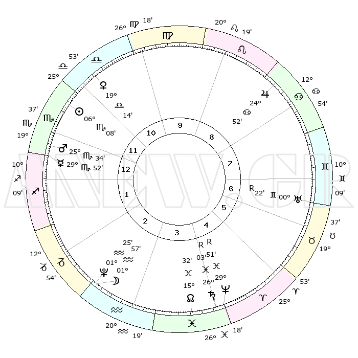 | | ΘΕΣΕΙΣ ΠΛΑΝΗΤΩΝ ΑΣΤΡΟΛΟΓΙΚΟΥ ΧΑΡΤΗ ΤΗΣ ΣΤΙΓΜΗΣ ΑΥΤΗΣ | | | | Πλανήτης | Ζώδιο | Μοίρες | Δεκαήμ. | Σε οίκο | Απόκλιση | | Ακμές των οίκων | | Ηλιος | Σκορπιός | 05°45' | Πρώτο | 3 | 13 S 26 | | 1ος | 14°26' | Λέων | | Σελήνη | Αιγόκερως | 27°01' | Τρίτο | 6 | 24 S 37 | | 2ος | 06°40' | Παρθένος | | Ερμής | Σκορπιός | 29°27' | Τρίτο | 4 | 22 S 48 | | 3ος | 03°39' | Ζυγός | | Αφροδίτη | Ζυγός | 18°44' | Δεύτερο | 3 | 05 S 57 | | 4ος | 06°02' | Σκορπιός | | Αρης | Σκορπιός | 25°17' | Τρίτο | 4 | 19 S 26 | | 5ος | 11°21' | Τοξότης | | Δίας | Καρκίνος | 24°51' | Τρίτο | 12 | 21 N 14 | | 6ος | 14°54' | Αιγόκερως | | Κρόνος | Ιχθείς | 26°04'R | Τρίτο | 8 | 03 S 50 | | 7ος | 14°26' | Υδροχόος | | Ουρανός | Δίδυμοι | 00°23'R | Πρώτο | 10 | 20 N 01 | | 8ος | 06°40' | Ιχθείς | | Ποσειδώνας | Ιχθείς | 29°51'R | Τρίτο | 8 | 01 S 19 | | 9ος | 03°39' | Κριός | | Πλούτωνας | Υδροχόος | 01°25' | Πρώτο | 6 | 23 S 31 | | 10ος | 06°02' | Ταύρος | | Β. Δεσμός | Ιχθείς | 15°34' | Δεύτερο | 8 | 05 S 41 | | 11ος | 11°21' | Δίδυμοι | | Ωροσκόπος | Λέων | 14°26' | Δεύτερο | | | 12ος | 14°54' | Καρκίνος | | Μεσουράνημα | Ταύρος | 06°02' | Πρώτο | | | |