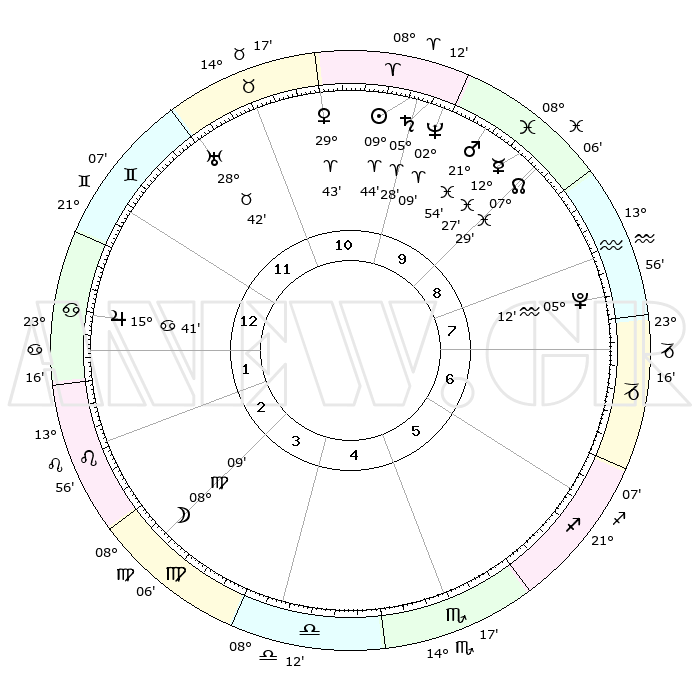 | | ΘΕΣΕΙΣ ΠΛΑΝΗΤΩΝ ΑΣΤΡΟΛΟΓΙΚΟΥ ΧΑΡΤΗ ΤΗΣ ΣΤΙΓΜΗΣ ΑΥΤΗΣ | | | | Πλανήτης | Ζώδιο | Μοίρες | Δεκαήμ. | Σε οίκο | Απόκλιση | | Ακμές των οίκων | | Ηλιος | Κριός | 09°39' | Πρώτο | 11 | 03 N 49 | | 1ος | 26°42' | Δίδυμοι | | Σελήνη | Παρθένος | 07°03' | Πρώτο | 4 | 09 N 04 | | 2ος | 17°43' | Καρκίνος | | Ερμής | Ιχθείς | 12°23' | Δεύτερο | 10 | 07 S 52 | | 3ος | 09°19' | Λέων | | Αφροδίτη | Κριός | 29°37' | Τρίτο | 11 | 10 N 51 | | 4ος | 05°07' | Παρθένος | | Αρης | Ιχθείς | 21°50' | Τρίτο | 10 | 04 S 12 | | 5ος | 08°31' | Ζυγός | | Δίας | Καρκίνος | 15°41' | Δεύτερο | 1 | 22 N 53 | | 6ος | 18°42' | Σκορπιός | | Κρόνος | Κριός | 05°27' | Πρώτο | 10 | 00 N 13 | | 7ος | 26°42' | Τοξότης | | Ουρανός | Ταύρος | 28°42' | Τρίτο | 12 | 19 N 42 | | 8ος | 17°43' | Αιγόκερως | | Ποσειδώνας | Κριός | 02°09' | Πρώτο | 10 | 00 S 21 | | 9ος | 09°19' | Υδροχόος | | Πλούτωνας | Υδροχόος | 05°11' | Πρώτο | 8 | 22 S 48 | | 10ος | 05°07' | Ιχθείς | | Β. Δεσμός | Ιχθείς | 07°29' | Πρώτο | 10 | 08 S 45 | | 11ος | 08°31' | Κριός | | Ωροσκόπος | Δίδυμοι | 26°42' | Τρίτο | | | 12ος | 18°42' | Ταύρος | | Μεσουράνημα | Ιχθείς | 05°07' | Πρώτο | | | |