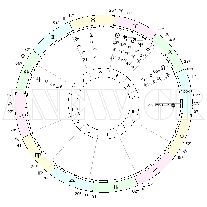 | | ΘΕΣΕΙΣ ΠΛΑΝΗΤΩΝ ΑΣΤΡΟΛΟΓΙΚΟΥ ΧΑΡΤΗ ΤΗΣ ΣΤΙΓΜΗΣ ΑΥΤΗΣ | | | | Πλανήτης | Ζώδιο | Μοίρες | Δεκαήμ. | Σε οίκο | Απόκλιση | | Ακμές των οίκων | | Ηλιος | Κριός | 23°28' | Τρίτο | 10 | 09 N 07 | | 1ος | 17°53' | Καρκίνος | | Σελήνη | Ιχθείς | 00°03' | Πρώτο | 8 | 12 S 08 | | 2ος | 08°22' | Λέων | | Ερμής | Ιχθείς | 27°35' | Τρίτο | 9 | 03 S 17 | | 3ος | 01°51' | Παρθένος | | Αφροδίτη | Ταύρος | 16°51' | Δεύτερο | 11 | 16 N 57 | | 4ος | 01°07' | Ζυγός | | Αρης | Κριός | 02°47' | Πρώτο | 10 | 00 N 12 | | 5ος | 07°01' | Σκορπιός | | Δίας | Καρκίνος | 16°48' | Δεύτερο | 12 | 22 N 45 | | 6ος | 14°46' | Τοξότης | | Κρόνος | Κριός | 07°11' | Πρώτο | 10 | 00 N 53 | | 7ος | 17°53' | Αιγόκερως | | Ουρανός | Ταύρος | 29°21' | Τρίτο | 11 | 19 N 50 | | 8ος | 08°22' | Υδροχόος | | Ποσειδώνας | Κριός | 02°40' | Πρώτο | 10 | 00 S 09 | | 9ος | 01°51' | Ιχθείς | | Πλούτωνας | Υδροχόος | 05°23' | Πρώτο | 7 | 22 S 47 | | 10ος | 01°07' | Κριός | | Β. Δεσμός | Ιχθείς | 06°45' | Πρώτο | 9 | 09 S 02 | | 11ος | 07°01' | Ταύρος | | Ωροσκόπος | Καρκίνος | 17°53' | Δεύτερο | | | 12ος | 14°46' | Δίδυμοι | | Μεσουράνημα | Κριός | 01°07' | Πρώτο | | | |