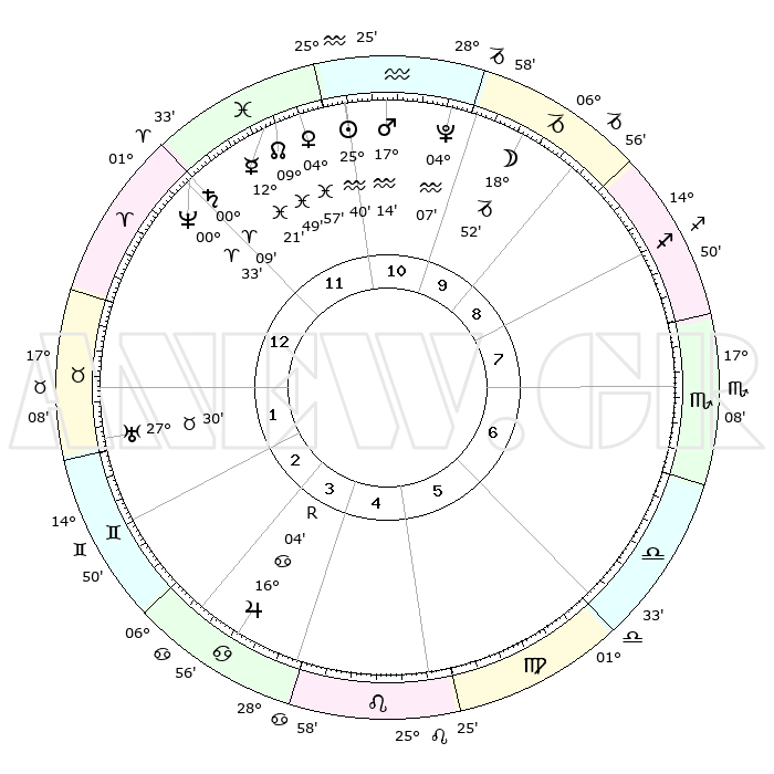 | | ΘΕΣΕΙΣ ΠΛΑΝΗΤΩΝ ΑΣΤΡΟΛΟΓΙΚΟΥ ΧΑΡΤΗ ΤΗΣ ΣΤΙΓΜΗΣ ΑΥΤΗΣ | | | | Πλανήτης | Ζώδιο | Μοίρες | Δεκαήμ. | Σε οίκο | Απόκλιση | | Ακμές των οίκων | | Ηλιος | Υδροχόος | 25°36' | Τρίτο | 11 | 12 S 59 | | 1ος | 11°28' | Κριός | | Σελήνη | Αιγόκερως | 18°03' | Δεύτερο | 10 | 26 S 16 | | 2ος | 18°48' | Ταύρος | | Ερμής | Ιχθείς | 12°15' | Δεύτερο | 12 | 07 S 04 | | 3ος | 14°34' | Δίδυμοι | | Αφροδίτη | Ιχθείς | 04°52' | Πρώτο | 12 | 11 S 05 | | 4ος | 06°28' | Καρκίνος | | Αρης | Υδροχόος | 17°11' | Δεύτερο | 11 | 16 S 43 | | 5ος | 29°23' | Καρκίνος | | Δίας | Καρκίνος | 16°05'R | Δεύτερο | 4 | 22 N 47 | | 6ος | 28°39' | Λέων | | Κρόνος | Κριός | 00°09' | Πρώτο | 12 | 01 S 55 | | 7ος | 11°28' | Ζυγός | | Ουρανός | Ταύρος | 27°30' | Τρίτο | 2 | 19 N 25 | | 8ος | 18°48' | Σκορπιός | | Ποσειδώνας | Κριός | 00°33' | Πρώτο | 12 | 00 S 59 | | 9ος | 14°34' | Τοξότης | | Πλούτωνας | Υδροχόος | 04°07' | Πρώτο | 11 | 22 S 57 | | 10ος | 06°28' | Αιγόκερως | | Β. Δεσμός | Ιχθείς | 09°49' | Πρώτο | 12 | 07 S 53 | | 11ος | 29°23' | Αιγόκερως | | Ωροσκόπος | Κριός | 11°28' | Δεύτερο | | | 12ος | 28°39' | Υδροχόος | | Μεσουράνημα | Αιγόκερως | 06°28' | Πρώτο | | | |