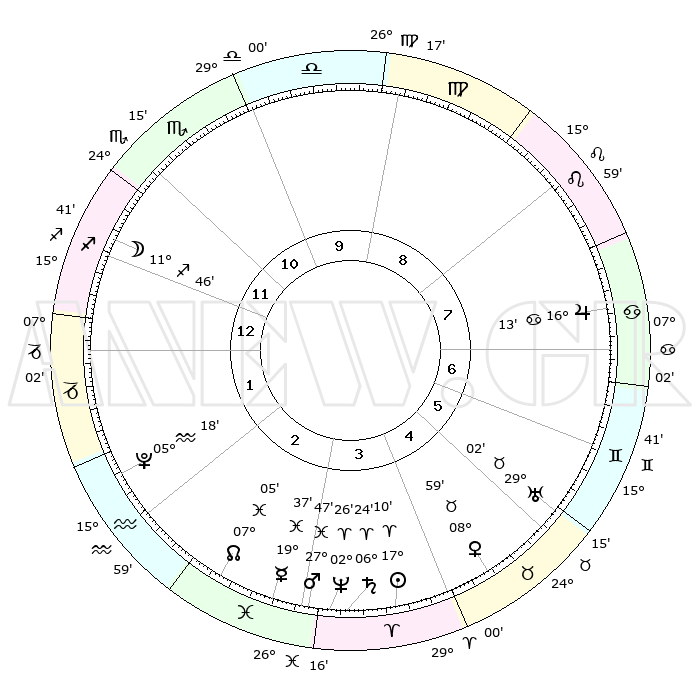 | | ΘΕΣΕΙΣ ΠΛΑΝΗΤΩΝ ΑΣΤΡΟΛΟΓΙΚΟΥ ΧΑΡΤΗ ΤΗΣ ΣΤΙΓΜΗΣ ΑΥΤΗΣ | | | | Πλανήτης | Ζώδιο | Μοίρες | Δεκαήμ. | Σε οίκο | Απόκλιση | | Ακμές των οίκων | | Ηλιος | Κριός | 17°06' | Δεύτερο | 4 | 06 N 43 | | 1ος | 16°16' | Τοξότης | | Σελήνη | Τοξότης | 11°01' | Δεύτερο | 12 | 27 S 12 | | 2ος | 20°13' | Αιγόκερως | | Ερμής | Ιχθείς | 19°33' | Δεύτερο | 3 | 06 S 02 | | 3ος | 28°38' | Υδροχόος | | Αφροδίτη | Ταύρος | 08°55' | Πρώτο | 5 | 14 N 17 | | 4ος | 04°15' | Κριός | | Αρης | Ιχθείς | 27°44' | Τρίτο | 3 | 01 S 50 | | 5ος | 02°51' | Ταύρος | | Δίας | Καρκίνος | 16°13' | Δεύτερο | 7 | 22 N 49 | | 6ος | 25°51' | Ταύρος | | Κρόνος | Κριός | 06°24' | Πρώτο | 4 | 00 N 35 | | 7ος | 16°16' | Δίδυμοι | | Ουρανός | Ταύρος | 29°02' | Τρίτο | 6 | 19 N 46 | | 8ος | 20°13' | Καρκίνος | | Ποσειδώνας | Κριός | 02°26' | Πρώτο | 3 | 00 S 14 | | 9ος | 28°38' | Λέων | | Πλούτωνας | Υδροχόος | 05°18' | Πρώτο | 2 | 22 S 47 | | 10ος | 04°15' | Ζυγός | | Β. Δεσμός | Ιχθείς | 07°05' | Πρώτο | 3 | 08 S 54 | | 11ος | 02°51' | Σκορπιός | | Ωροσκόπος | Τοξότης | 16°16' | Δεύτερο | | | 12ος | 25°51' | Σκορπιός | | Μεσουράνημα | Ζυγός | 04°15' | Πρώτο | | | |