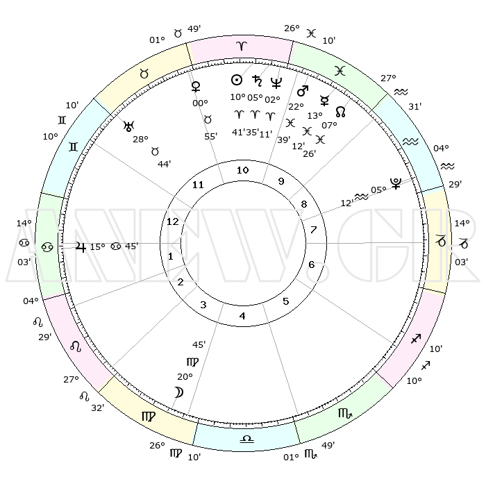 | | ΘΕΣΕΙΣ ΠΛΑΝΗΤΩΝ ΑΣΤΡΟΛΟΓΙΚΟΥ ΧΑΡΤΗ ΤΗΣ ΣΤΙΓΜΗΣ ΑΥΤΗΣ | | | | Πλανήτης | Ζώδιο | Μοίρες | Δεκαήμ. | Σε οίκο | Απόκλιση | | Ακμές των οίκων | | Ηλιος | Κριός | 10°38' | Δεύτερο | 11 | 04 N 12 | | 1ος | 25°16' | Δίδυμοι | | Σελήνη | Παρθένος | 20°00' | Τρίτο | 4 | 03 N 01 | | 2ος | 16°24' | Καρκίνος | | Ερμής | Ιχθείς | 13°10' | Δεύτερο | 10 | 07 S 43 | | 3ος | 07°56' | Λέων | | Αφροδίτη | Ταύρος | 00°51' | Πρώτο | 11 | 11 N 19 | | 4ος | 03°31' | Παρθένος | | Αρης | Ιχθείς | 22°37' | Τρίτο | 10 | 03 S 54 | | 5ος | 06°39' | Ζυγός | | Δίας | Καρκίνος | 15°44' | Δεύτερο | 1 | 22 N 52 | | 6ος | 16°54' | Σκορπιός | | Κρόνος | Κριός | 05°35' | Πρώτο | 10 | 00 N 16 | | 7ος | 25°16' | Τοξότης | | Ουρανός | Ταύρος | 28°44' | Τρίτο | 12 | 19 N 42 | | 8ος | 16°24' | Αιγόκερως | | Ποσειδώνας | Κριός | 02°11' | Πρώτο | 10 | 00 S 20 | | 9ος | 07°56' | Υδροχόος | | Πλούτωνας | Υδροχόος | 05°12' | Πρώτο | 8 | 22 S 47 | | 10ος | 03°31' | Ιχθείς | | Β. Δεσμός | Ιχθείς | 07°26' | Πρώτο | 10 | 08 S 47 | | 11ος | 06°39' | Κριός | | Ωροσκόπος | Δίδυμοι | 25°16' | Τρίτο | | | 12ος | 16°54' | Ταύρος | | Μεσουράνημα | Ιχθείς | 03°31' | Πρώτο | | | |