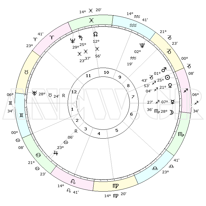 | | ΘΕΣΕΙΣ ΠΛΑΝΗΤΩΝ ΑΣΤΡΟΛΟΓΙΚΟΥ ΧΑΡΤΗ ΤΗΣ ΣΤΙΓΜΗΣ ΑΥΤΗΣ | | | | Πλανήτης | Ζώδιο | Μοίρες | Δεκαήμ. | Σε οίκο | Απόκλιση | | Ακμές των οίκων | | Ηλιος | Τοξότης | 25°48' | Τρίτο | 9 | 23 S 22 | | 1ος | 28°21' | Κριός | | Σελήνη | Σκορπιός | 27°38' | Τρίτο | 7 | 24 S 20 | | 2ος | 01°01' | Δίδυμοι | | Ερμής | Τοξότης | 07°20' | Πρώτο | 8 | 20 S 19 | | 3ος | 24°45' | Δίδυμοι | | Αφροδίτη | Τοξότης | 20°58' | Τρίτο | 8 | 23 S 04 | | 4ος | 16°26' | Καρκίνος | | Αρης | Αιγόκερως | 01°39' | Πρώτο | 9 | 24 S 13 | | 5ος | 10°41' | Λέων | | Δίας | Καρκίνος | 23°06'R | Τρίτο | 4 | 21 N 39 | | 6ος | 13°04' | Παρθένος | | Κρόνος | Ιχθείς | 25°37' | Τρίτο | 12 | 03 S 52 | | 7ος | 28°21' | Ζυγός | | Ουρανός | Ταύρος | 28°24'R | Τρίτο | 1 | 19 N 36 | | 8ος | 01°01' | Τοξότης | | Ποσειδώνας | Ιχθείς | 29°23' | Τρίτο | 12 | 01 S 29 | | 9ος | 24°45' | Τοξότης | | Πλούτωνας | Υδροχόος | 02°18' | Πρώτο | 10 | 23 S 19 | | 10ος | 16°26' | Αιγόκερως | | Β. Δεσμός | Ιχθείς | 12°56' | Δεύτερο | 11 | 06 S 42 | | 11ος | 10°41' | Υδροχόος | | Ωροσκόπος | Κριός | 28°21' | Τρίτο | | | 12ος | 13°04' | Ιχθείς | | Μεσουράνημα | Αιγόκερως | 16°26' | Δεύτερο | | | |
