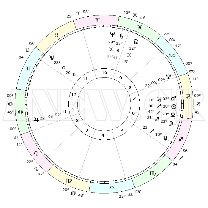 | | ΘΕΣΕΙΣ ΠΛΑΝΗΤΩΝ ΑΣΤΡΟΛΟΓΙΚΟΥ ΧΑΡΤΗ ΤΗΣ ΣΤΙΓΜΗΣ ΑΥΤΗΣ | | | | Πλανήτης | Ζώδιο | Μοίρες | Δεκαήμ. | Σε οίκο | Απόκλιση | | Ακμές των οίκων | | Ηλιος | Τοξότης | 27°56' | Τρίτο | 7 | 23 S 25 | | 1ος | 17°09' | Δίδυμοι | | Σελήνη | Τοξότης | 22°42' | Τρίτο | 7 | 28 S 08 | | 2ος | 09°08' | Καρκίνος | | Ερμής | Τοξότης | 10°17' | Δεύτερο | 6 | 21 S 03 | | 3ος | 00°24' | Λέων | | Αφροδίτη | Τοξότης | 23°36' | Τρίτο | 7 | 23 S 18 | | 4ος | 24°52' | Λέων | | Αρης | Αιγόκερως | 03°15' | Πρώτο | 7 | 24 S 12 | | 5ος | 26°30' | Παρθένος | | Δίας | Καρκίνος | 22°52'R | Τρίτο | 2 | 21 N 42 | | 6ος | 06°43' | Σκορπιός | | Κρόνος | Ιχθείς | 25°41' | Τρίτο | 10 | 03 S 50 | | 7ος | 17°09' | Τοξότης | | Ουρανός | Ταύρος | 28°20'R | Τρίτο | 12 | 19 N 35 | | 8ος | 09°08' | Αιγόκερως | | Ποσειδώνας | Ιχθείς | 29°24' | Τρίτο | 11 | 01 S 28 | | 9ος | 00°24' | Υδροχόος | | Πλούτωνας | Υδροχόος | 02°22' | Πρώτο | 9 | 23 S 18 | | 10ος | 24°52' | Υδροχόος | | Β. Δεσμός | Ιχθείς | 12°50' | Δεύτερο | 10 | 06 S 45 | | 11ος | 26°30' | Ιχθείς | | Ωροσκόπος | Δίδυμοι | 17°09' | Δεύτερο | | | 12ος | 06°43' | Ταύρος | | Μεσουράνημα | Υδροχόος | 24°52' | Τρίτο | | | |