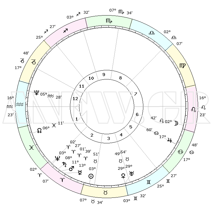| | ΘΕΣΕΙΣ ΠΛΑΝΗΤΩΝ ΑΣΤΡΟΛΟΓΙΚΟΥ ΧΑΡΤΗ ΤΗΣ ΣΤΙΓΜΗΣ ΑΥΤΗΣ | | | | Πλανήτης | Ζώδιο | Μοίρες | Δεκαήμ. | Σε οίκο | Απόκλιση | | Ακμές των οίκων | | Ηλιος | Ταύρος | 03°47' | Πρώτο | 3 | 12 N 46 | | 1ος | 12°56' | Αιγόκερως | | Σελήνη | Λέων | 01°37' | Πρώτο | 7 | 22 N 42 | | 2ος | 23°23' | Υδροχόος | | Ερμής | Κριός | 13°31' | Δεύτερο | 3 | 03 N 02 | | 3ος | 03°36' | Κριός | | Αφροδίτη | Ταύρος | 29°44' | Τρίτο | 5 | 20 N 39 | | 4ος | 05°14' | Ταύρος | | Αρης | Κριός | 10°57' | Δεύτερο | 3 | 03 N 29 | | 5ος | 29°41' | Ταύρος | | Δίας | Καρκίνος | 17°59' | Δεύτερο | 7 | 22 N 36 | | 6ος | 20°57' | Δίδυμοι | | Κρόνος | Κριός | 08°27' | Πρώτο | 3 | 01 N 22 | | 7ος | 12°56' | Καρκίνος | | Ουρανός | Ταύρος | 29°53' | Τρίτο | 5 | 19 N 58 | | 8ος | 23°23' | Λέων | | Ποσειδώνας | Κριός | 03°02' | Πρώτο | 2 | 00 S 00 | | 9ος | 03°36' | Ζυγός | | Πλούτωνας | Υδροχόος | 05°28' | Πρώτο | 1 | 22 S 48 | | 10ος | 05°14' | Σκορπιός | | Β. Δεσμός | Ιχθείς | 06°11' | Πρώτο | 2 | 09 S 14 | | 11ος | 29°41' | Σκορπιός | | Ωροσκόπος | Αιγόκερως | 12°56' | Δεύτερο | | | 12ος | 20°57' | Τοξότης | | Μεσουράνημα | Σκορπιός | 05°14' | Πρώτο | | | |