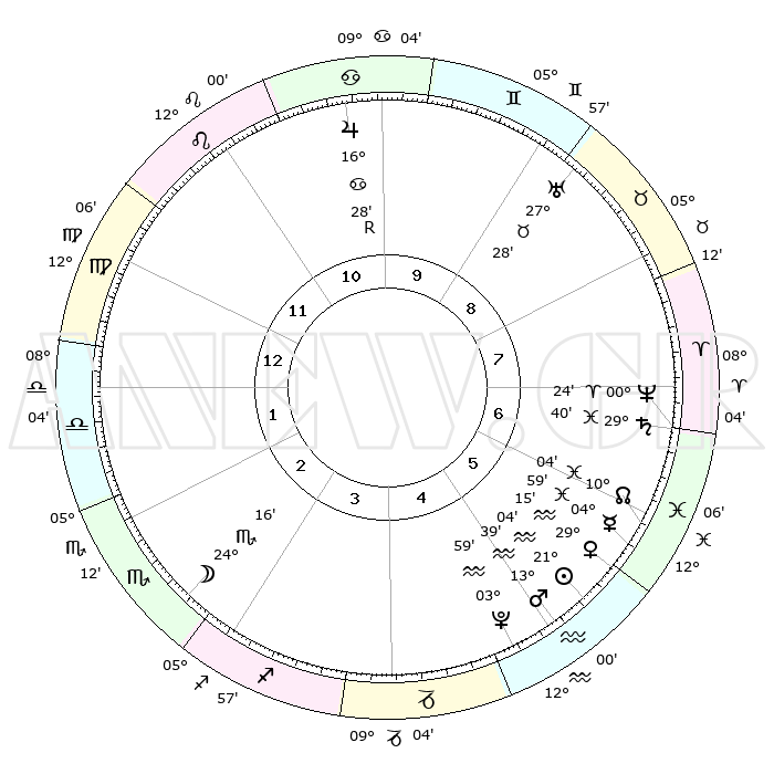 | | ΘΕΣΕΙΣ ΠΛΑΝΗΤΩΝ ΑΣΤΡΟΛΟΓΙΚΟΥ ΧΑΡΤΗ ΤΗΣ ΣΤΙΓΜΗΣ ΑΥΤΗΣ | | | | Πλανήτης | Ζώδιο | Μοίρες | Δεκαήμ. | Σε οίκο | Απόκλιση | | Ακμές των οίκων | | Ηλιος | Υδροχόος | 21°01' | Τρίτο | 5 | 14 S 29 | | 1ος | 21°41' | Παρθένος | | Σελήνη | Σκορπιός | 23°36' | Τρίτο | 3 | 23 S 34 | | 2ος | 17°37' | Ζυγός | | Ερμής | Ιχθείς | 04°54' | Πρώτο | 6 | 10 S 35 | | 3ος | 17°43' | Σκορπιός | | Αφροδίτη | Υδροχόος | 29°11' | Τρίτο | 6 | 13 S 07 | | 4ος | 20°39' | Τοξότης | | Αρης | Υδροχόος | 13°37' | Δεύτερο | 5 | 17 S 45 | | 5ος | 23°47' | Αιγόκερως | | Δίας | Καρκίνος | 16°28'R | Δεύτερο | 10 | 22 N 44 | | 6ος | 24°32' | Υδροχόος | | Κρόνος | Ιχθείς | 29°39' | Τρίτο | 7 | 02 S 07 | | 7ος | 21°41' | Ιχθείς | | Ουρανός | Ταύρος | 27°28' | Τρίτο | 9 | 19 N 25 | | 8ος | 17°37' | Κριός | | Ποσειδώνας | Κριός | 00°24' | Πρώτο | 7 | 01 S 03 | | 9ος | 17°43' | Ταύρος | | Πλούτωνας | Υδροχόος | 03°59' | Πρώτο | 5 | 22 S 58 | | 10ος | 20°39' | Δίδυμοι | | Β. Δεσμός | Ιχθείς | 10°04' | Δεύτερο | 6 | 07 S 48 | | 11ος | 23°47' | Καρκίνος | | Ωροσκόπος | Παρθένος | 21°41' | Τρίτο | | | 12ος | 24°32' | Λέων | | Μεσουράνημα | Δίδυμοι | 20°39' | Τρίτο | | | |