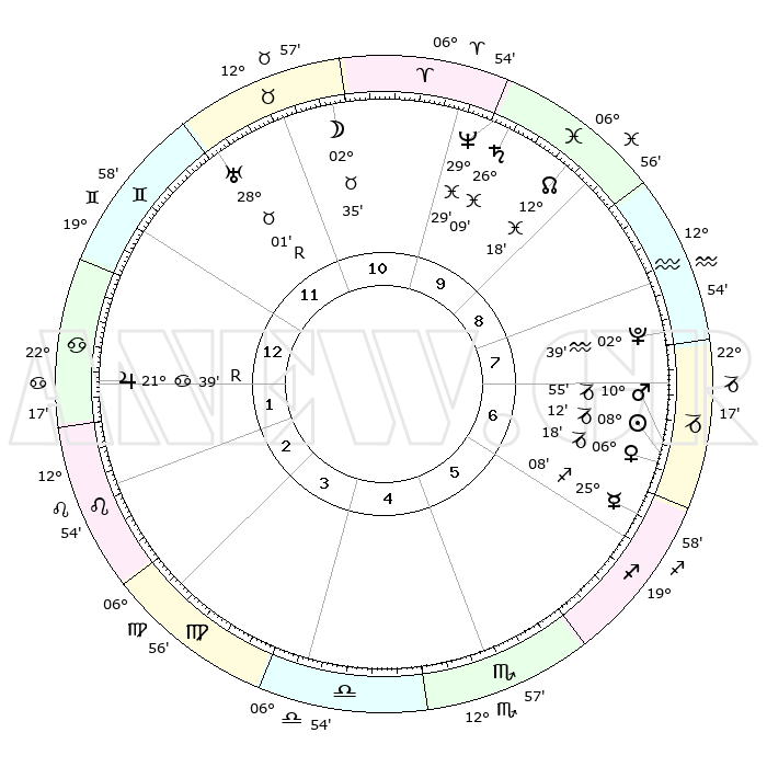 | | ΘΕΣΕΙΣ ΠΛΑΝΗΤΩΝ ΑΣΤΡΟΛΟΓΙΚΟΥ ΧΑΡΤΗ ΤΗΣ ΣΤΙΓΜΗΣ ΑΥΤΗΣ | | | | Πλανήτης | Ζώδιο | Μοίρες | Δεκαήμ. | Σε οίκο | Απόκλιση | | Ακμές των οίκων | | Ηλιος | Αιγόκερως | 08°08' | Πρώτο | 7 | 23 S 11 | | 1ος | 29°18' | Δίδυμοι | | Σελήνη | Ταύρος | 01°32' | Πρώτο | 11 | 15 N 40 | | 2ος | 20°09' | Καρκίνος | | Ερμής | Τοξότης | 25°01' | Τρίτο | 6 | 23 S 38 | | 3ος | 11°54' | Λέων | | Αφροδίτη | Αιγόκερως | 06°12' | Πρώτο | 7 | 23 S 42 | | 4ος | 08°06' | Παρθένος | | Αρης | Αιγόκερως | 10°52' | Δεύτερο | 7 | 23 S 52 | | 5ος | 11°56' | Ζυγός | | Δίας | Καρκίνος | 21°40'R | Τρίτο | 2 | 21 N 55 | | 6ος | 21°59' | Σκορπιός | | Κρόνος | Ιχθείς | 26°09' | Τρίτο | 10 | 03 S 37 | | 7ος | 29°18' | Τοξότης | | Ουρανός | Ταύρος | 28°01'R | Τρίτο | 12 | 19 N 31 | | 8ος | 20°09' | Αιγόκερως | | Ποσειδώνας | Ιχθείς | 29°29' | Τρίτο | 10 | 01 S 26 | | 9ος | 11°54' | Υδροχόος | | Πλούτωνας | Υδροχόος | 02°39' | Πρώτο | 8 | 23 S 14 | | 10ος | 08°06' | Ιχθείς | | Β. Δεσμός | Ιχθείς | 12°18' | Δεύτερο | 10 | 06 S 57 | | 11ος | 11°56' | Κριός | | Ωροσκόπος | Δίδυμοι | 29°18' | Τρίτο | | | 12ος | 21°59' | Ταύρος | | Μεσουράνημα | Ιχθείς | 08°06' | Πρώτο | | | |